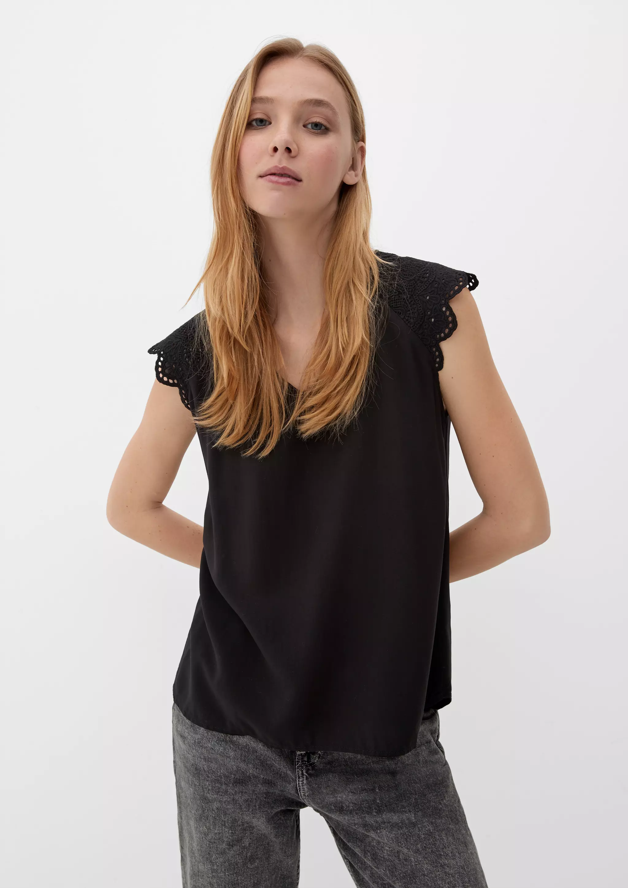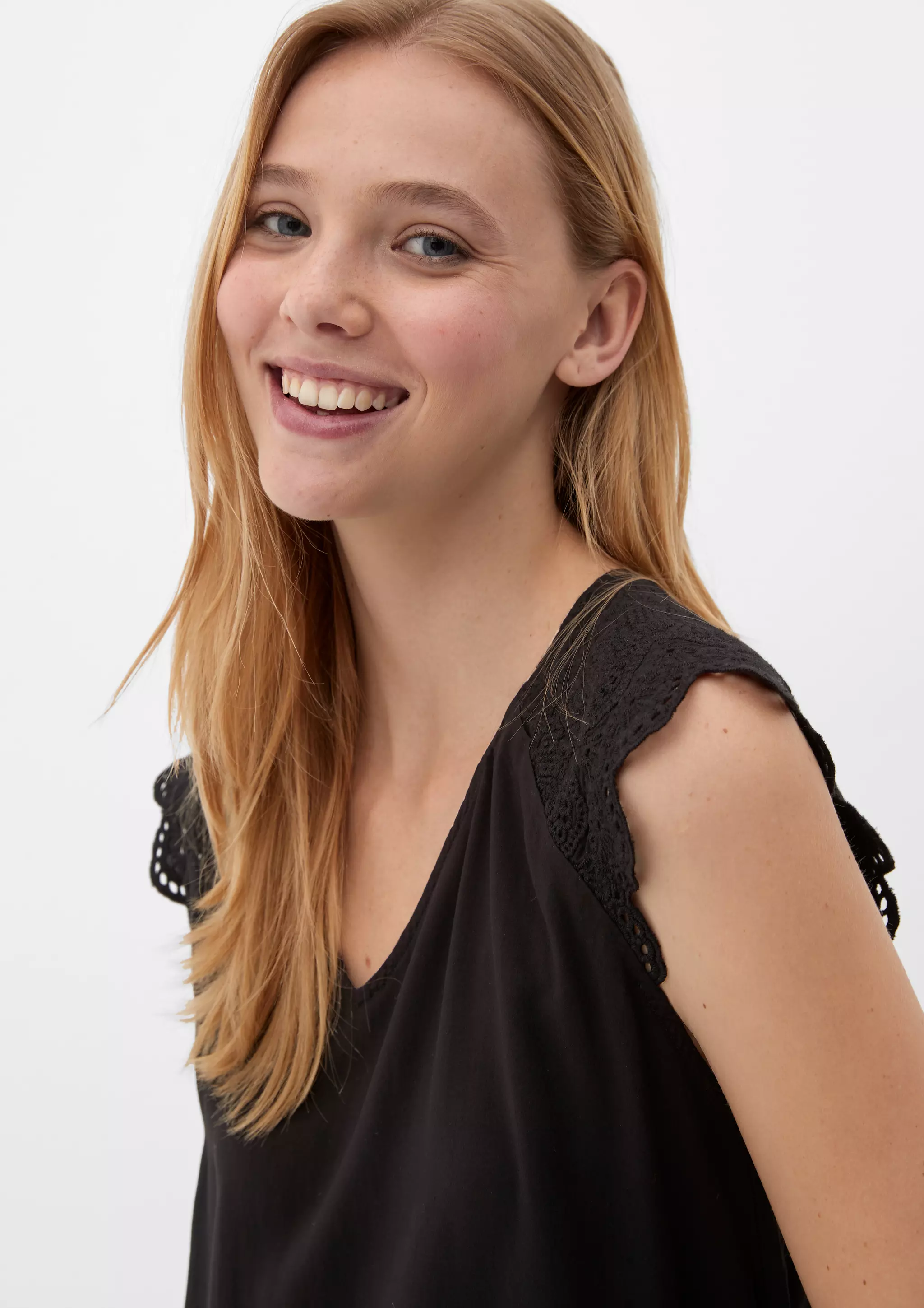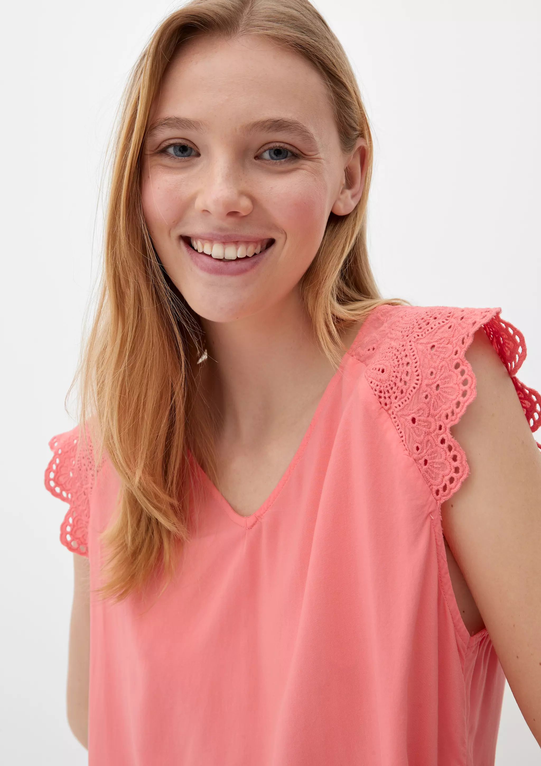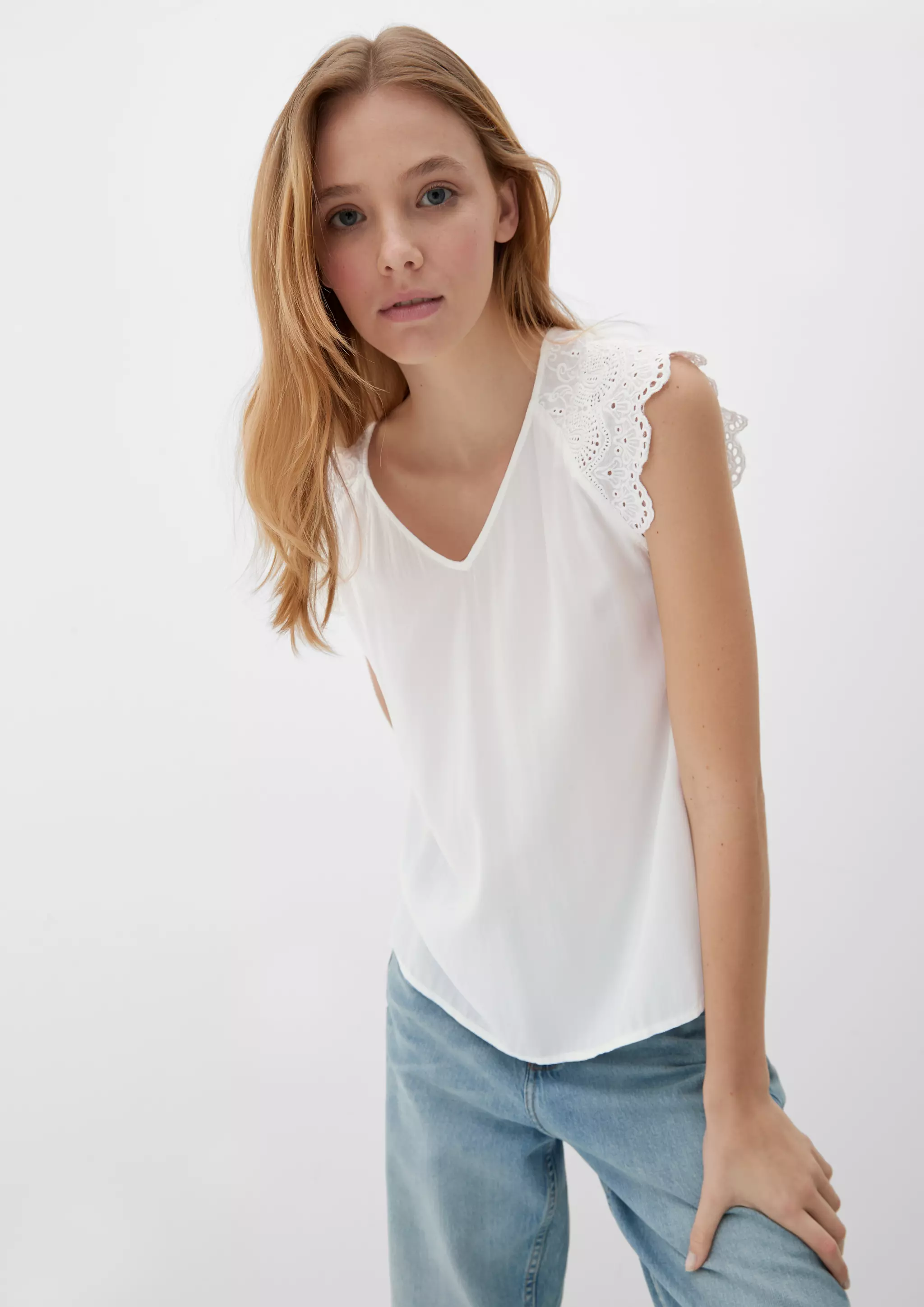 Entdecke sommerliche Leichtigkeit mit dieser ärmellosen V-Ausschnitt-Bluse. Die hochwertige Lochstickerei verleiht dir einen lässigen Casual-Look. Perfekt für entspannte Tage und coole Abende - dein neuer Liebling im Regular Fit.