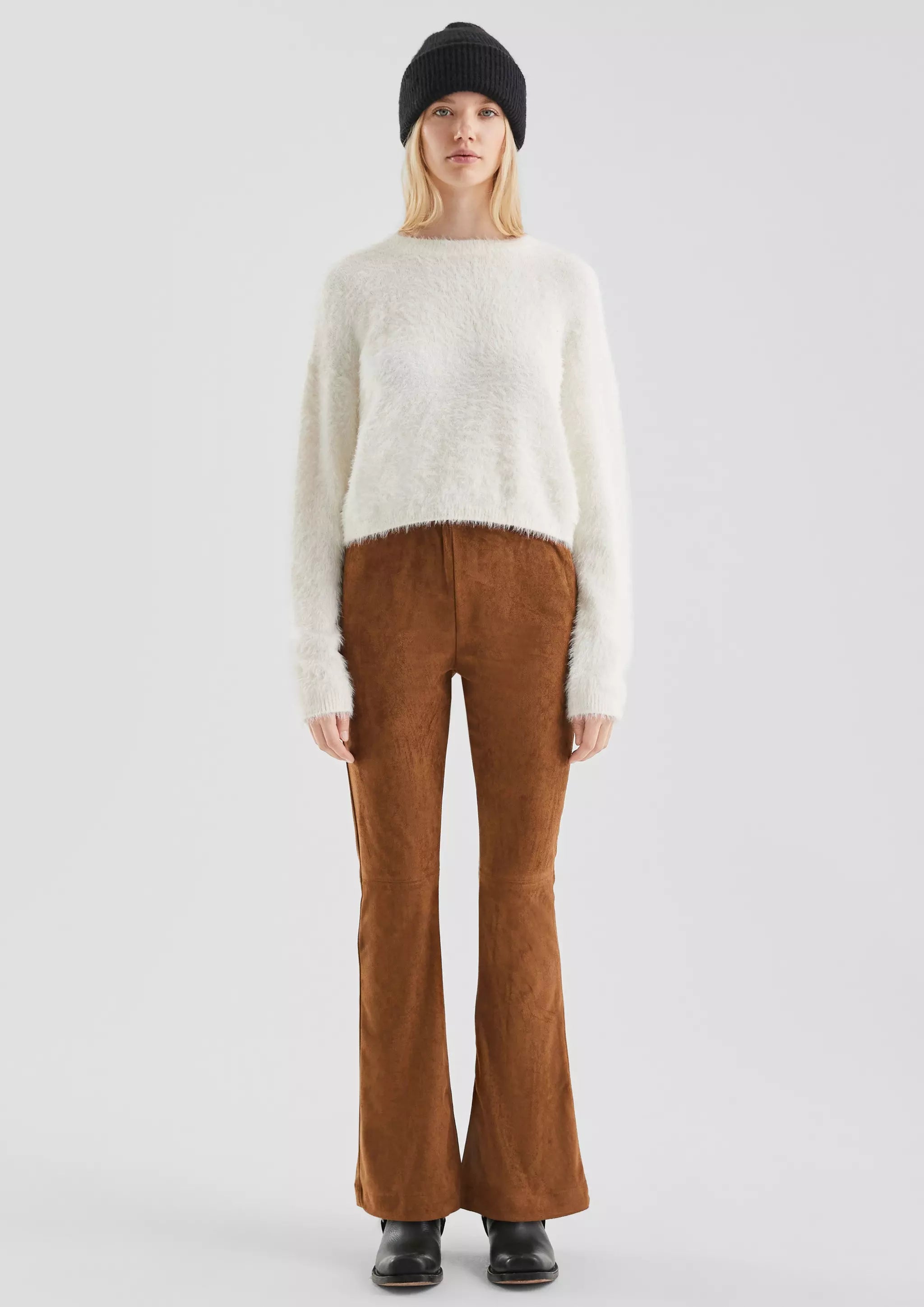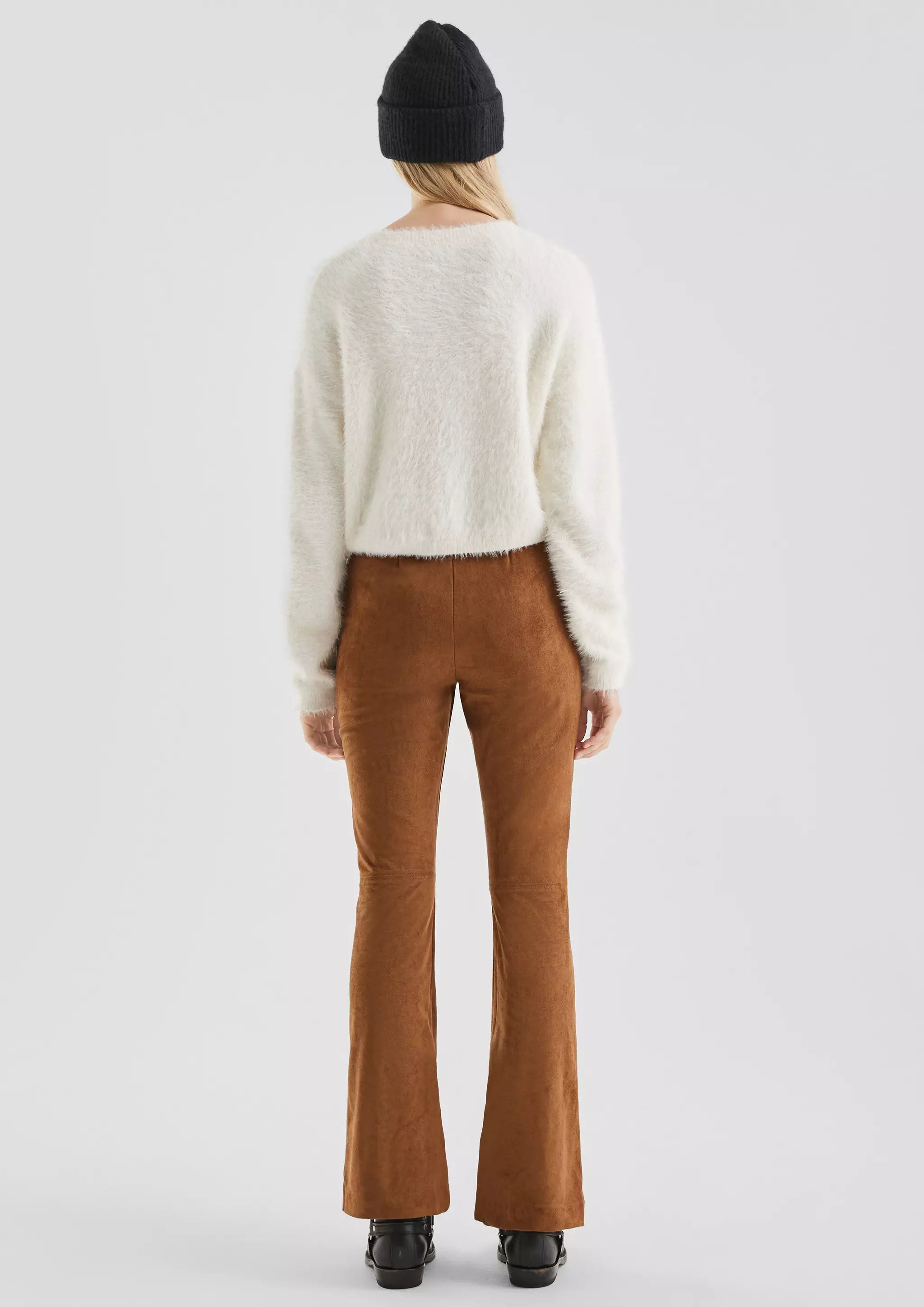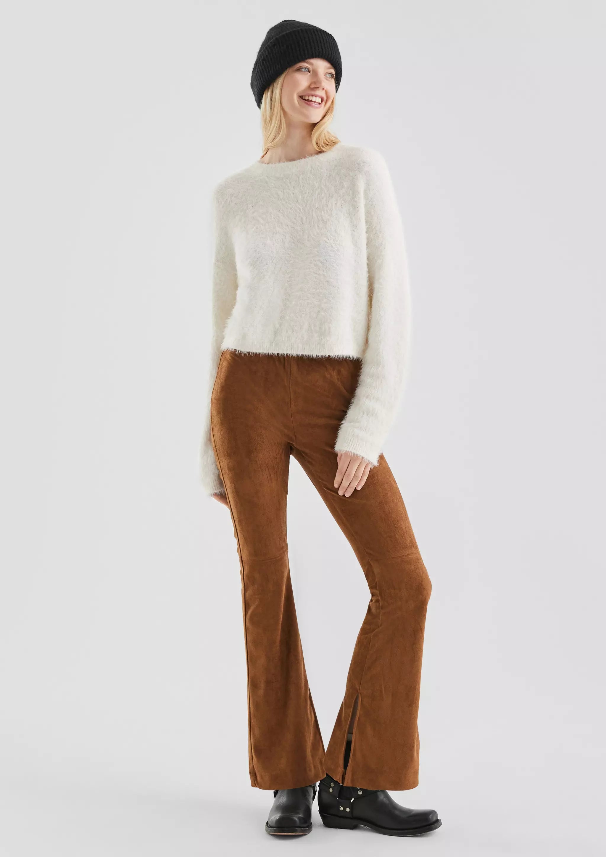 Diese angesagte Bootcut-Hose in softer Wildlederoptik kombiniert lässigen Retro-Style mit modernem Komfort. Der hohe Bund und das leicht ausgestellte Bein schaffen eine schmeichelnde Silhouette - perfekt für deinen nächsten City-Trip oder Partyabend.