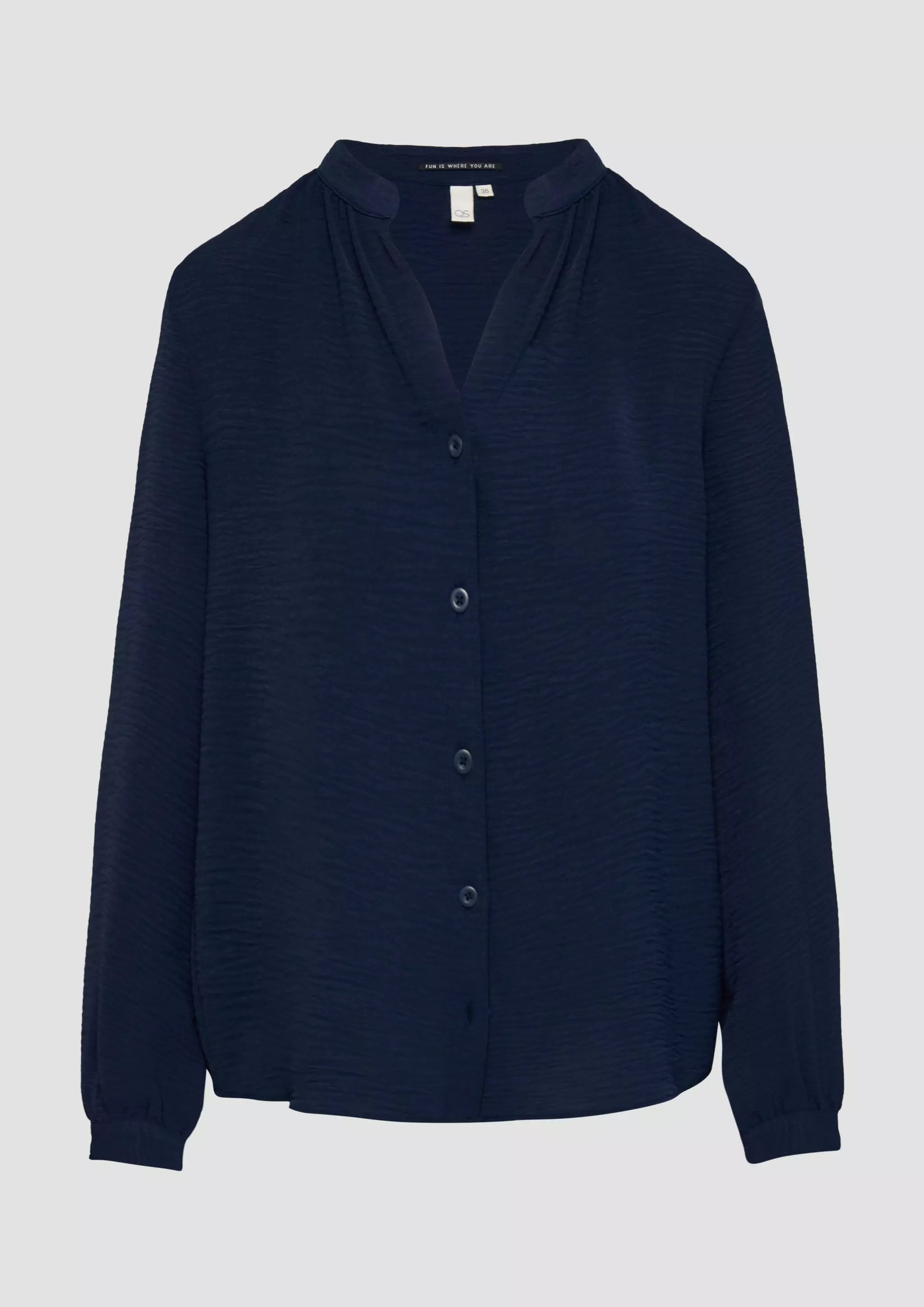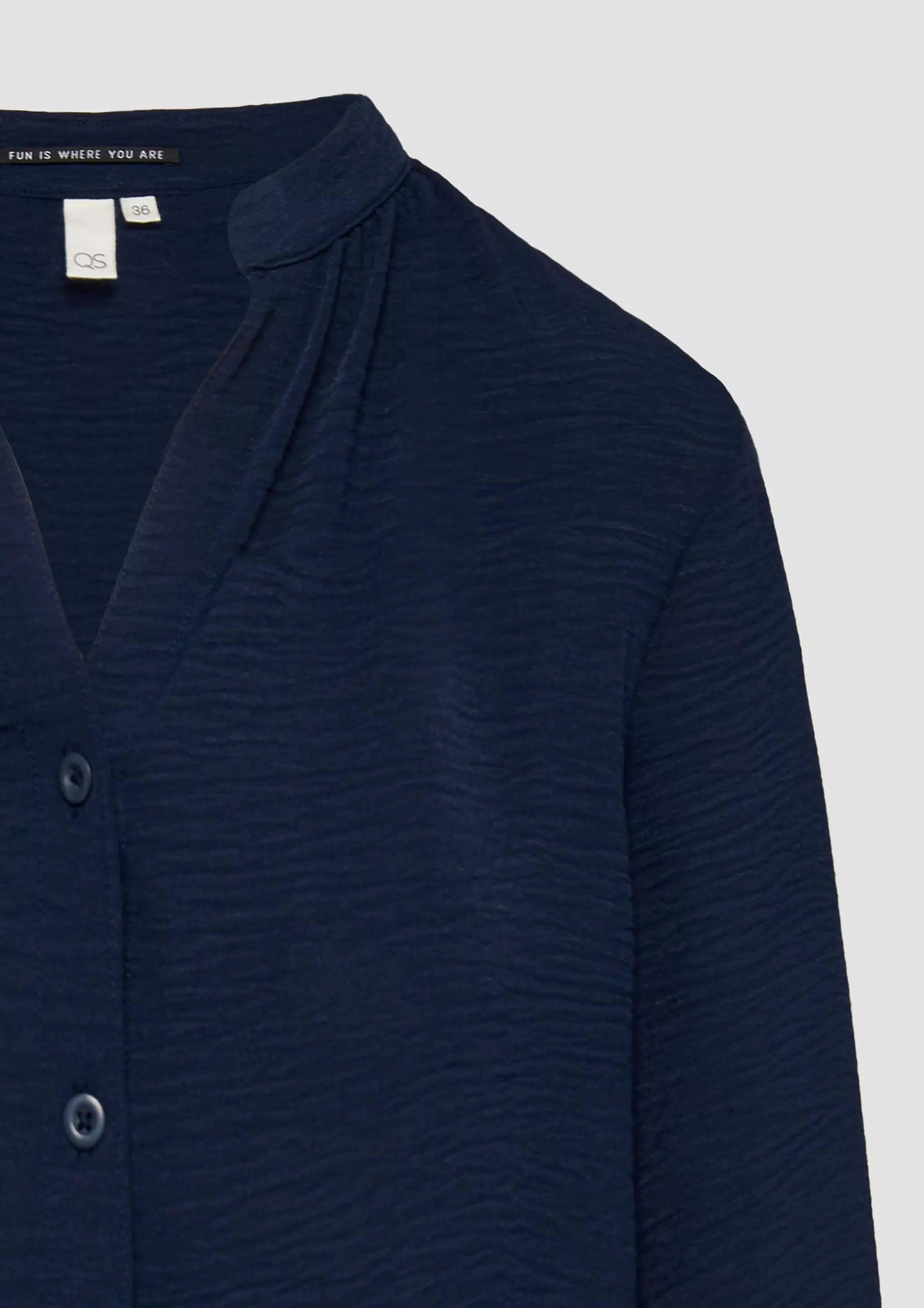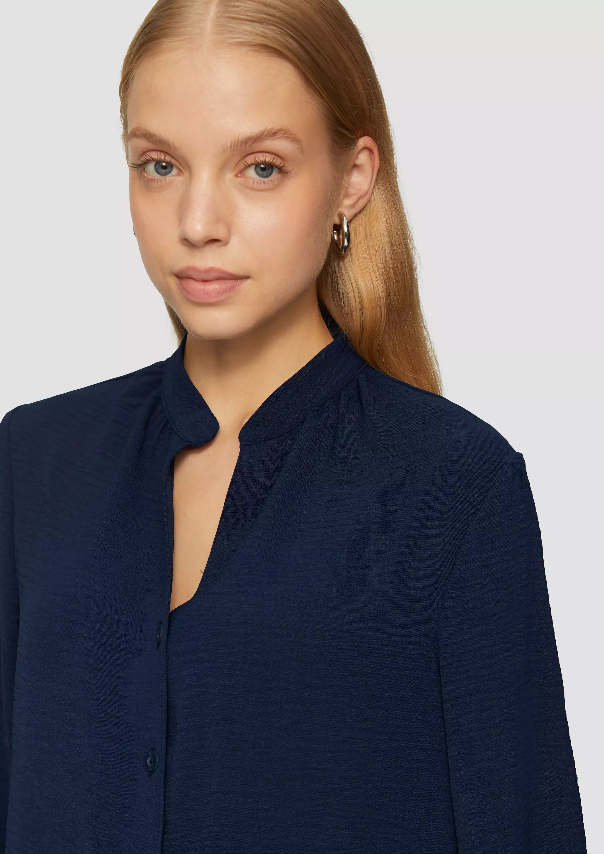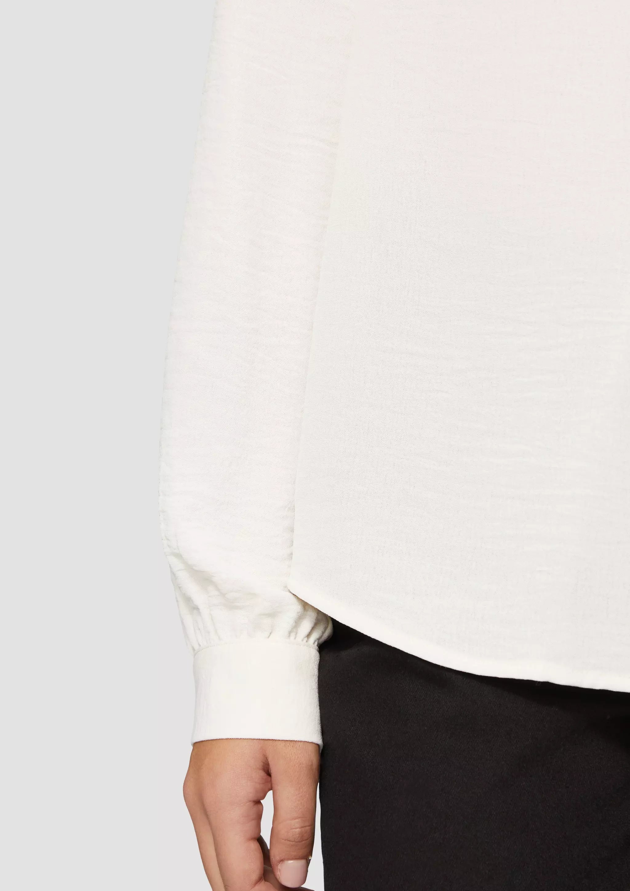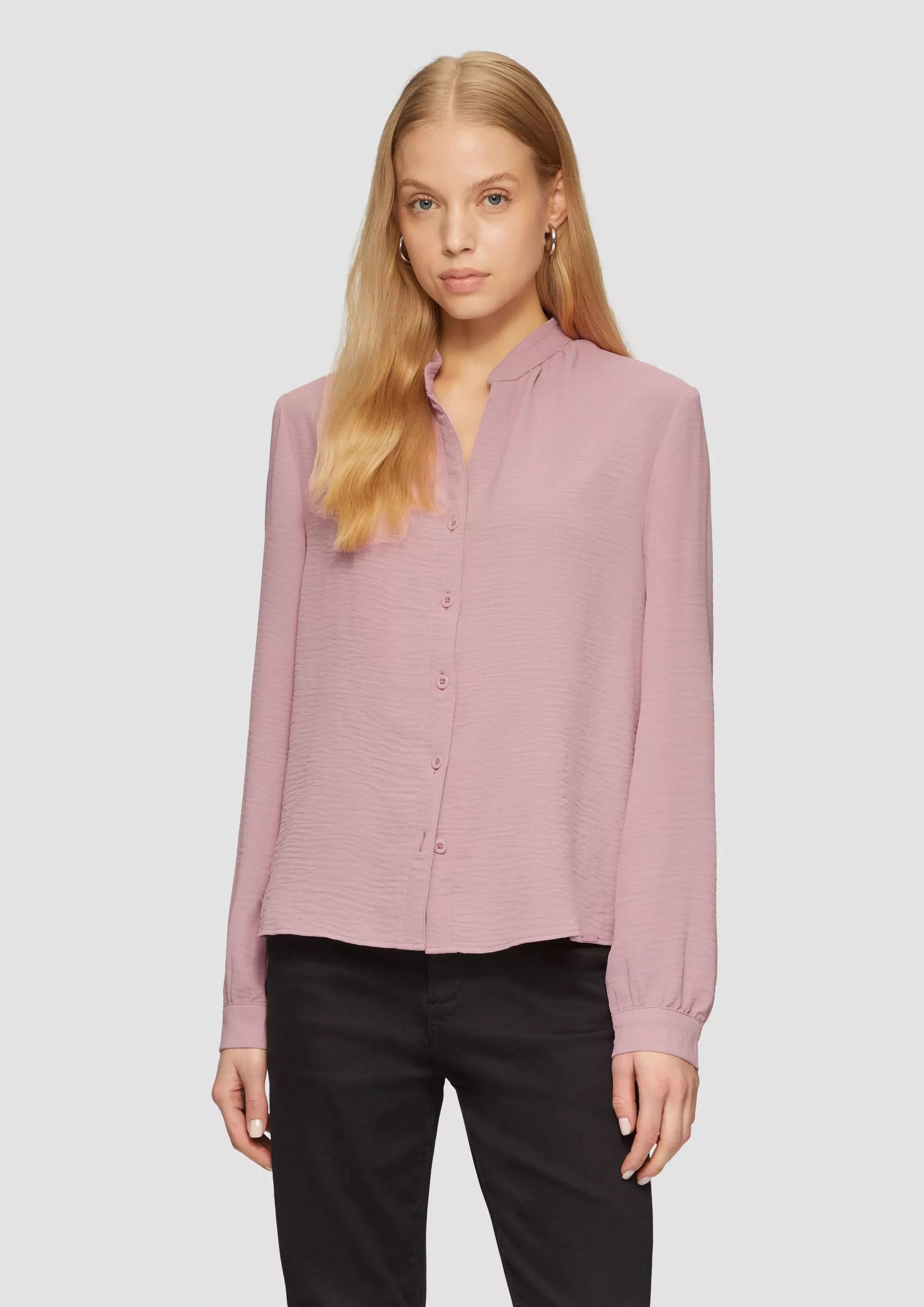 Stylische Crêpe-Bluse mit coolem Rundhalsausschnitt und Knopfleiste. Dein neuer Liebling für lässige Outfits! Feminin und fließend, mit raffinierten Details wie Manschetten und Stehkragen. Perfekt für deinen individuellen Look im Alltag.