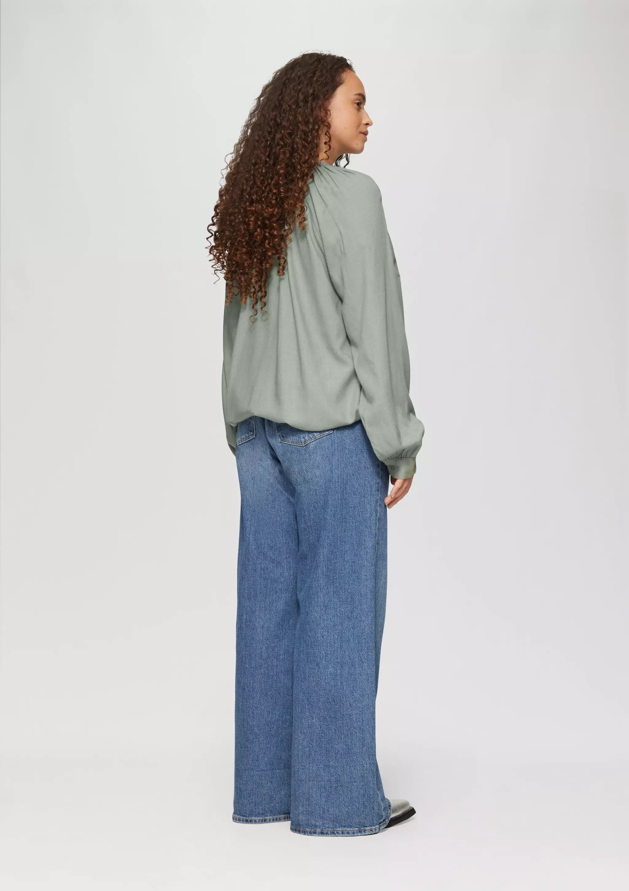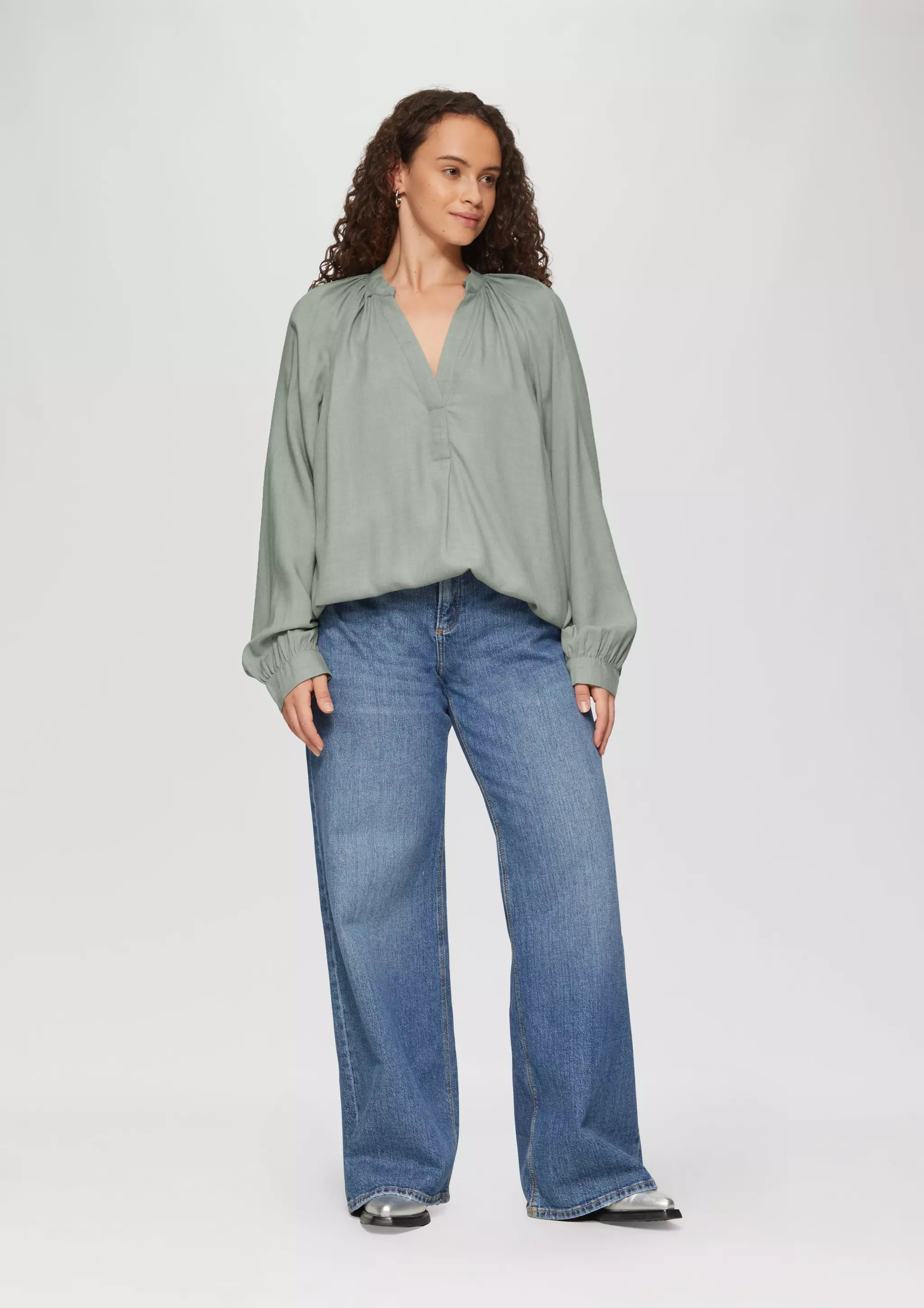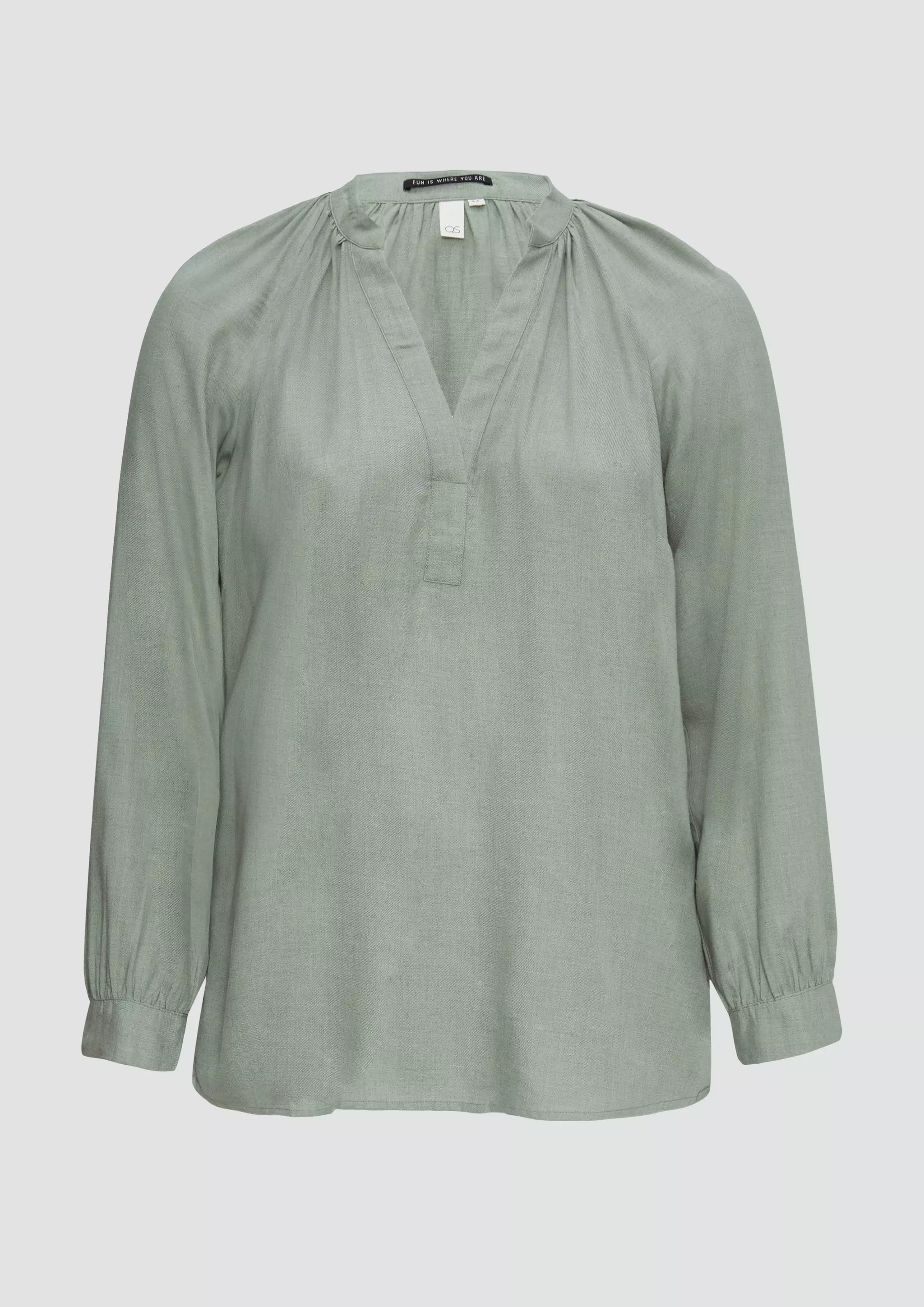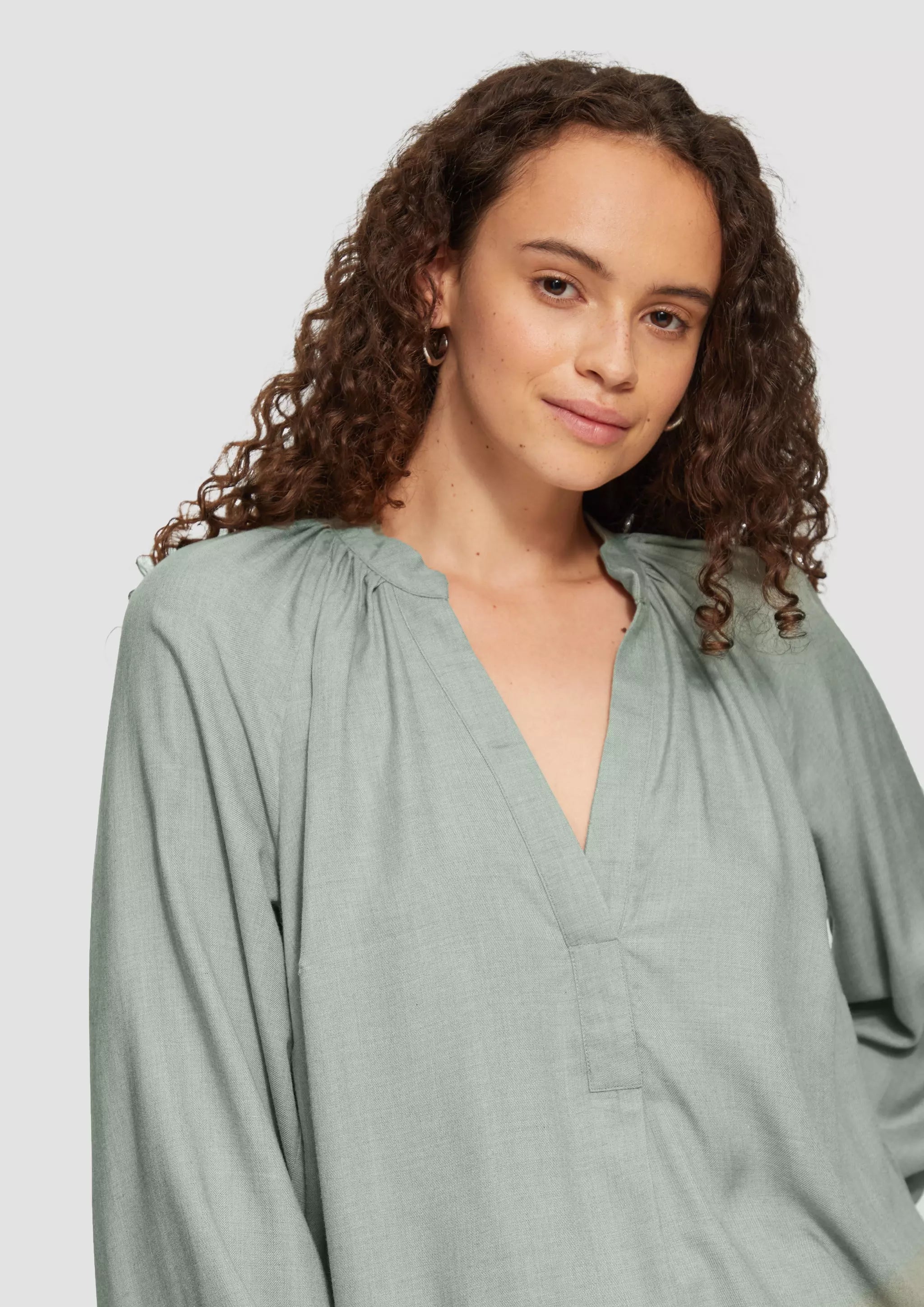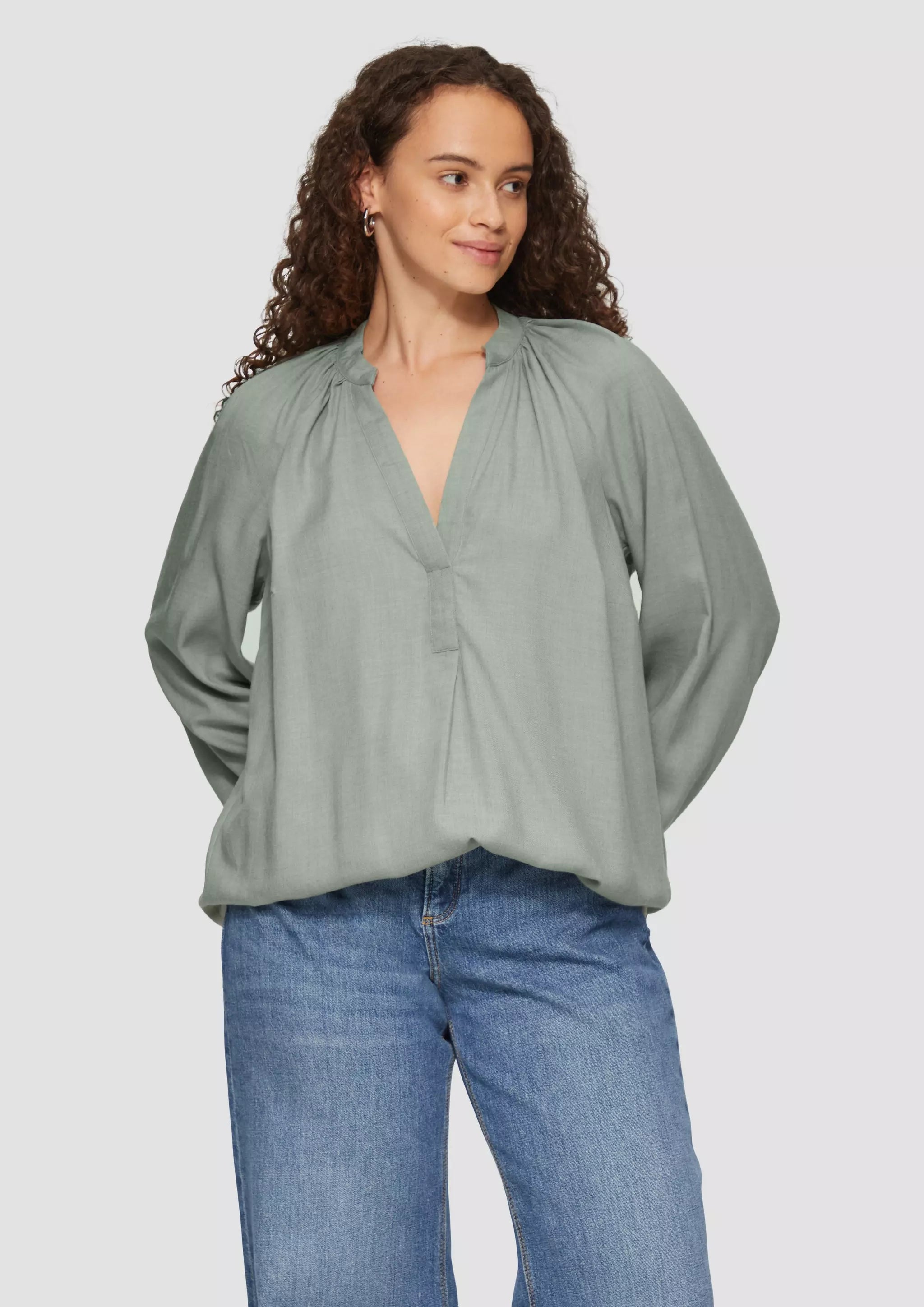 Entdecke urbanen Chic mit dieser melierten Viskosebluse. Der feminine Regular Fit mit Raffung und Stehkragen verleiht dir einen lässigen Look. Perfekt für den Alltag oder coole Abende - diese kuschelige Bluse ist dein neuer Liebling.