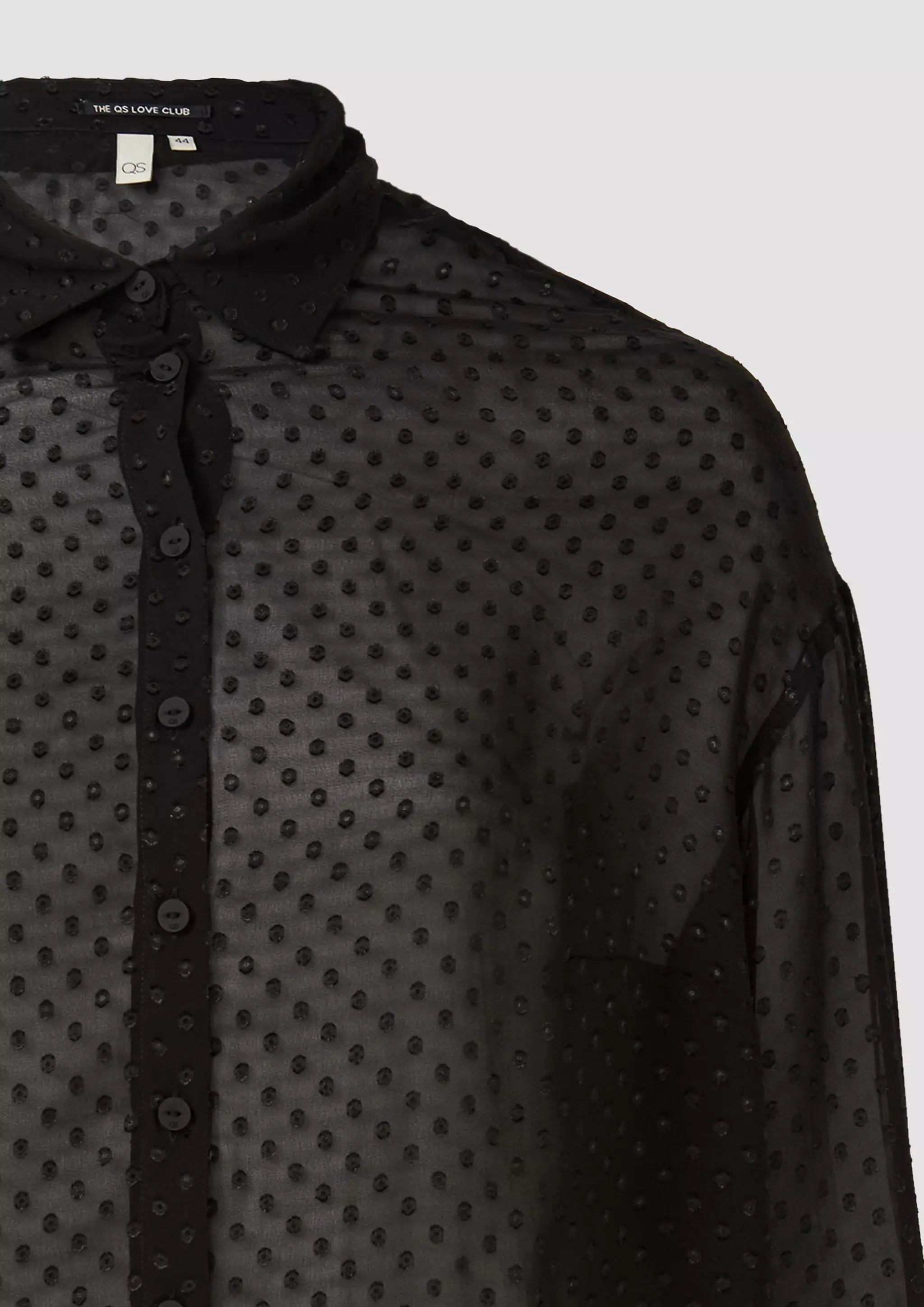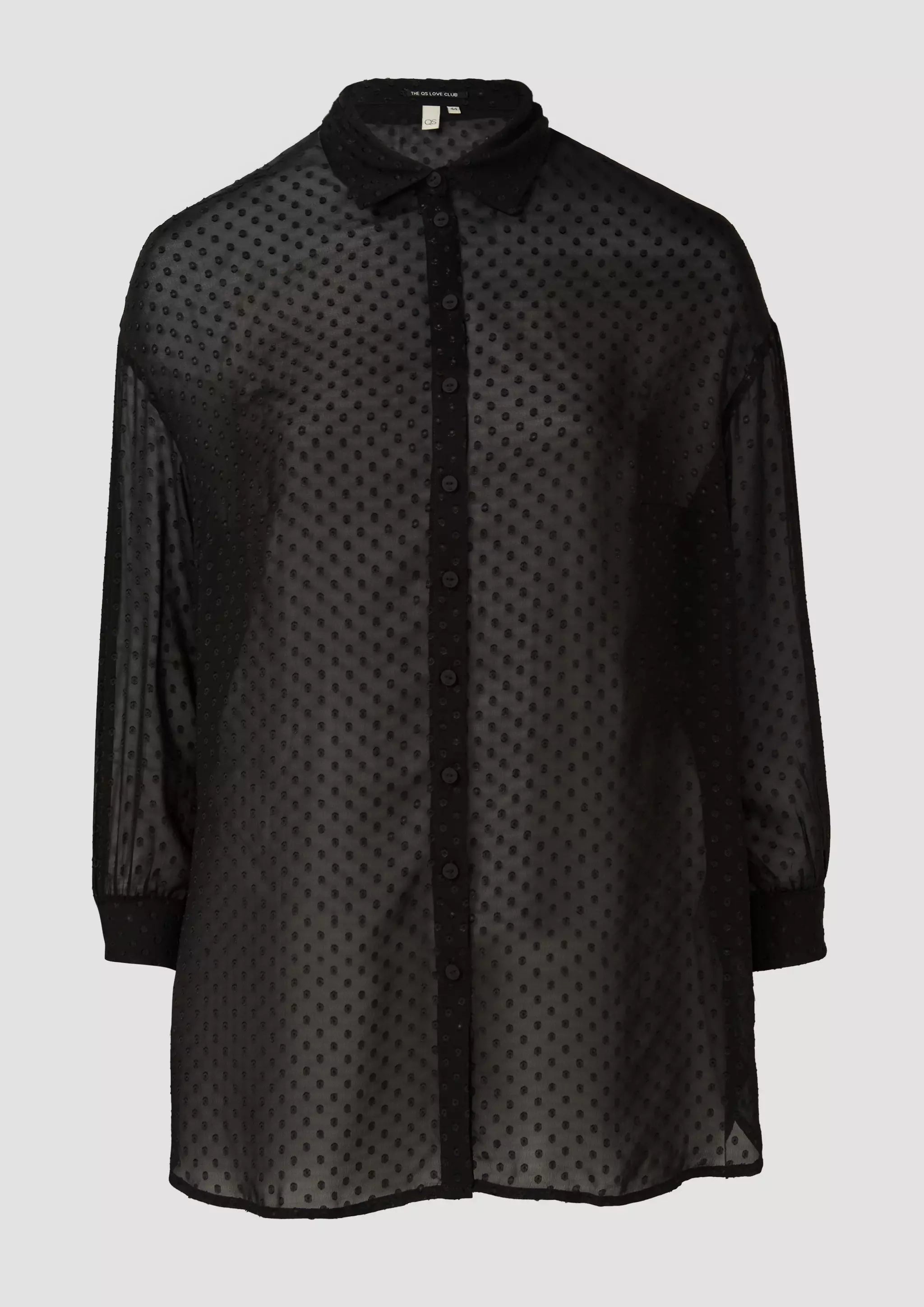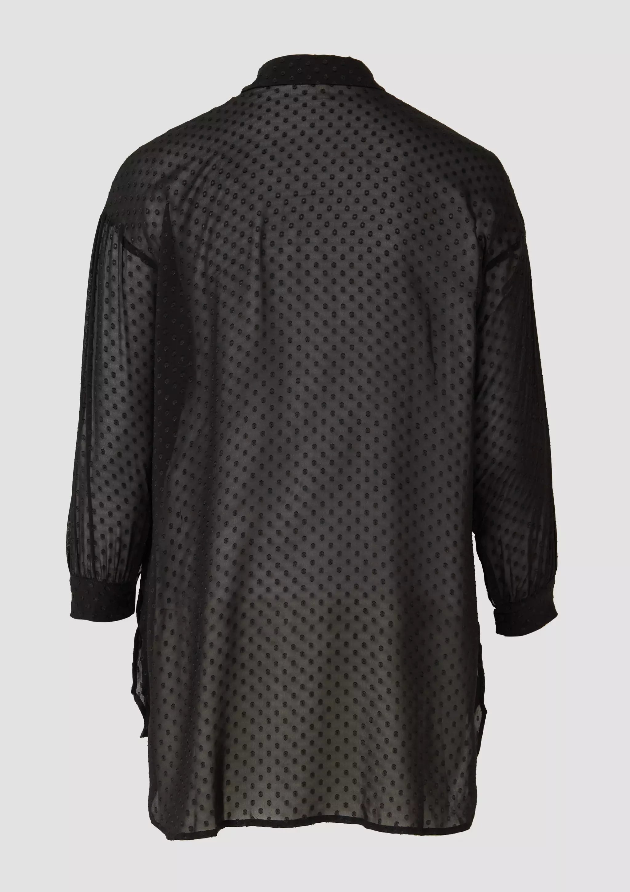 Diese Oversize-Bluse aus leichtem Chiffon wird dein neuer Liebling für entspannte Tage und coole Abende. Der fließende Stoff mit Allover-Muster, überschnittene Schultern und der abgerundete Saum mit seitlichen Schlitzen sorgen für einen lässigen Look. Die leicht transparente Optik mit Hemdkragen und Manschetten macht sie zum perfekten Style-Partner für Casual-Vibes und Party-Momente.