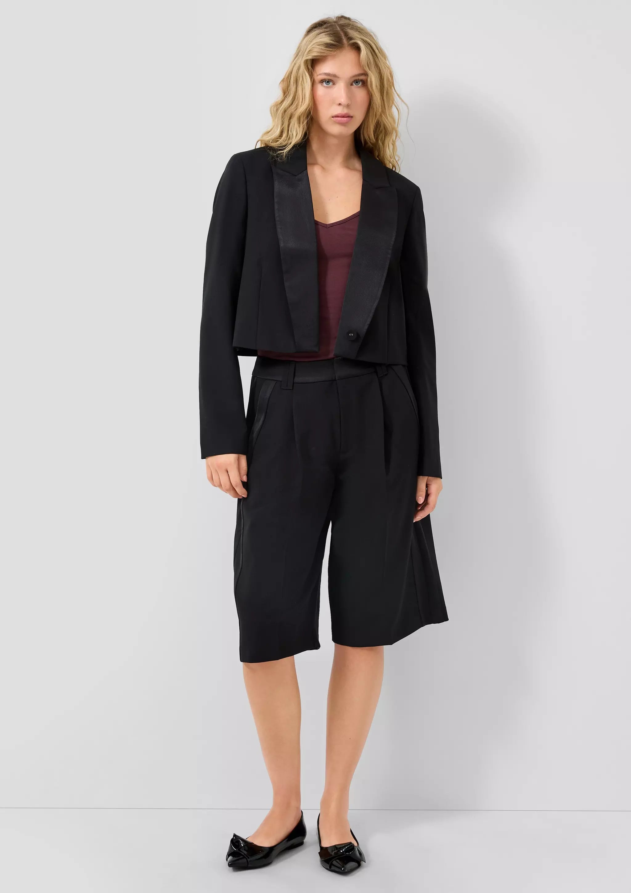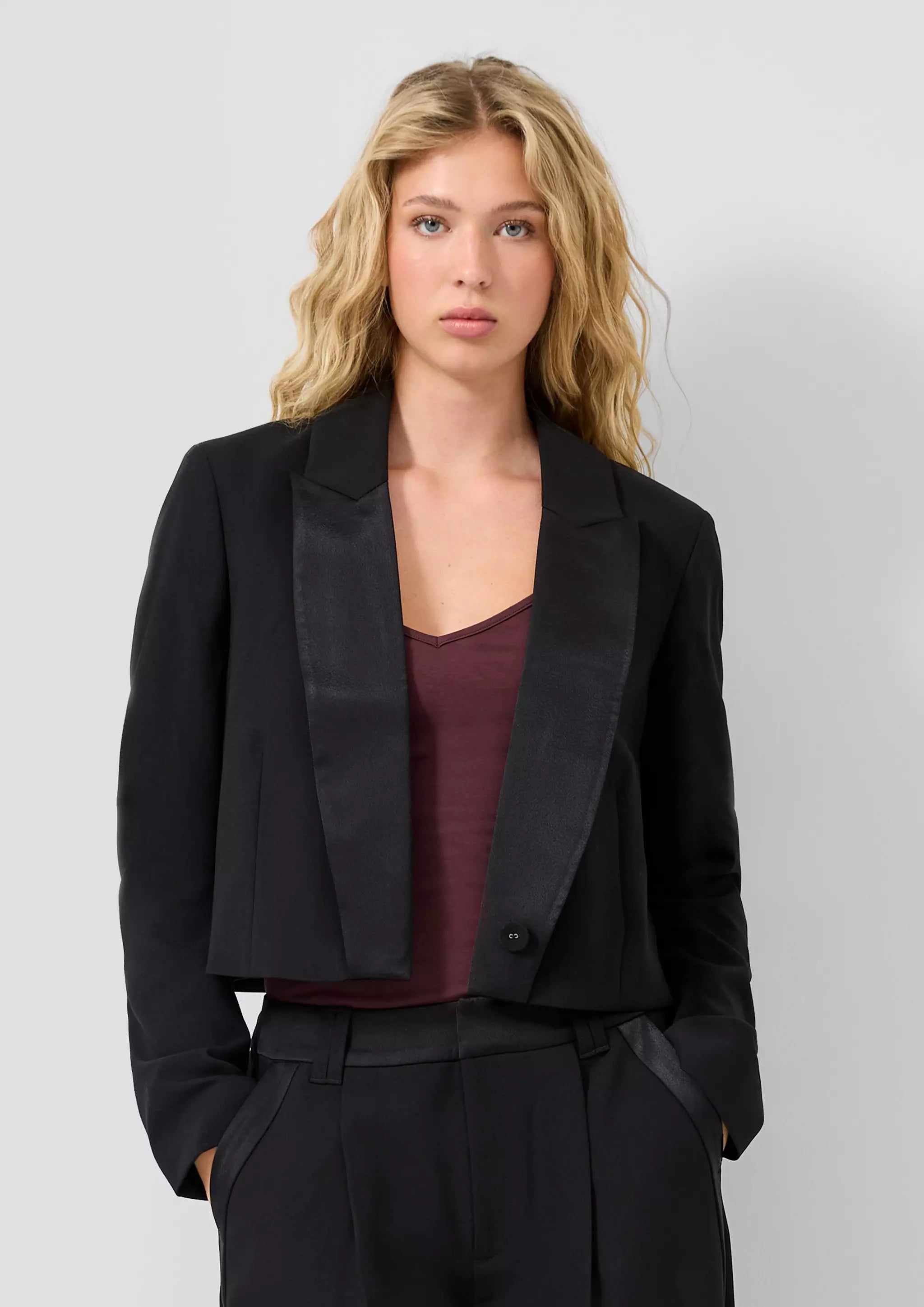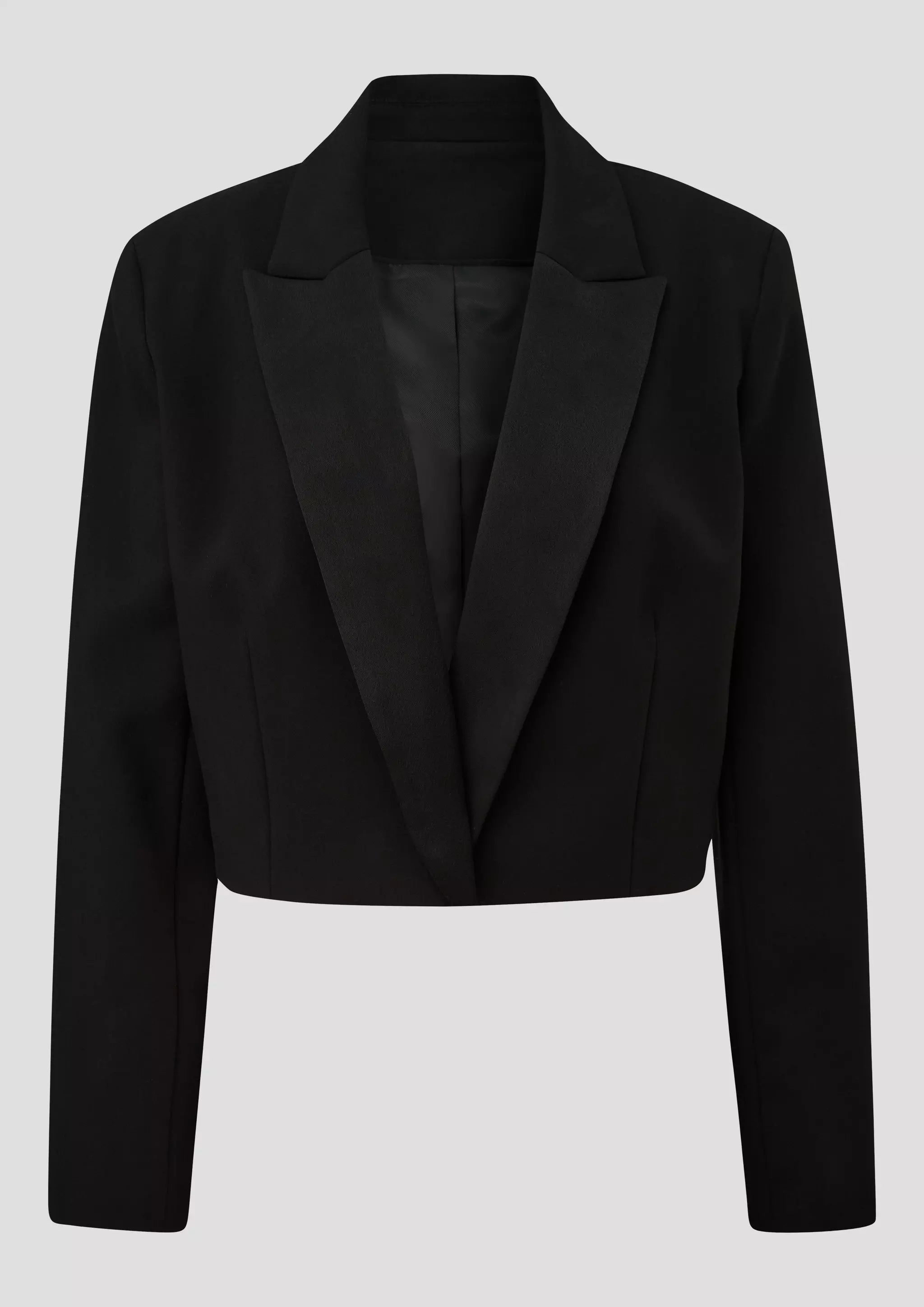 Dieser stylische Kurzblazer aus der QS x Vanessa Mai Kollektion macht dich zum Hingucker auf jedem Event. Der edle Satinbesatz am Reverskragen verleiht dem Regular-Fit-Schnitt eine glamouröse Note. Perfekt für festliche Anlässe, wenn du elegant auftreten willst. Der hochwertige Twill-Stoff mit Taftfutter sorgt für den perfekten Look.