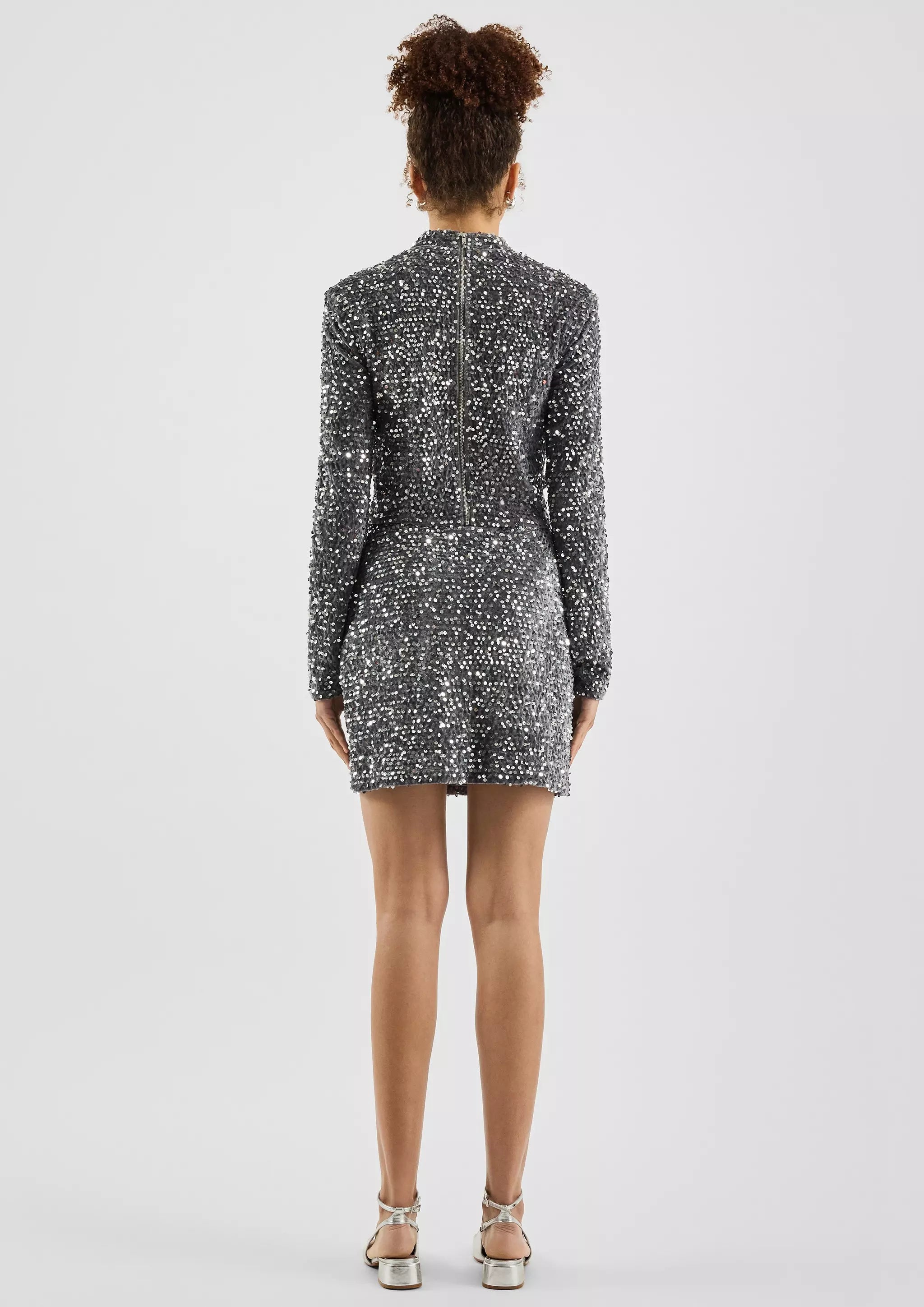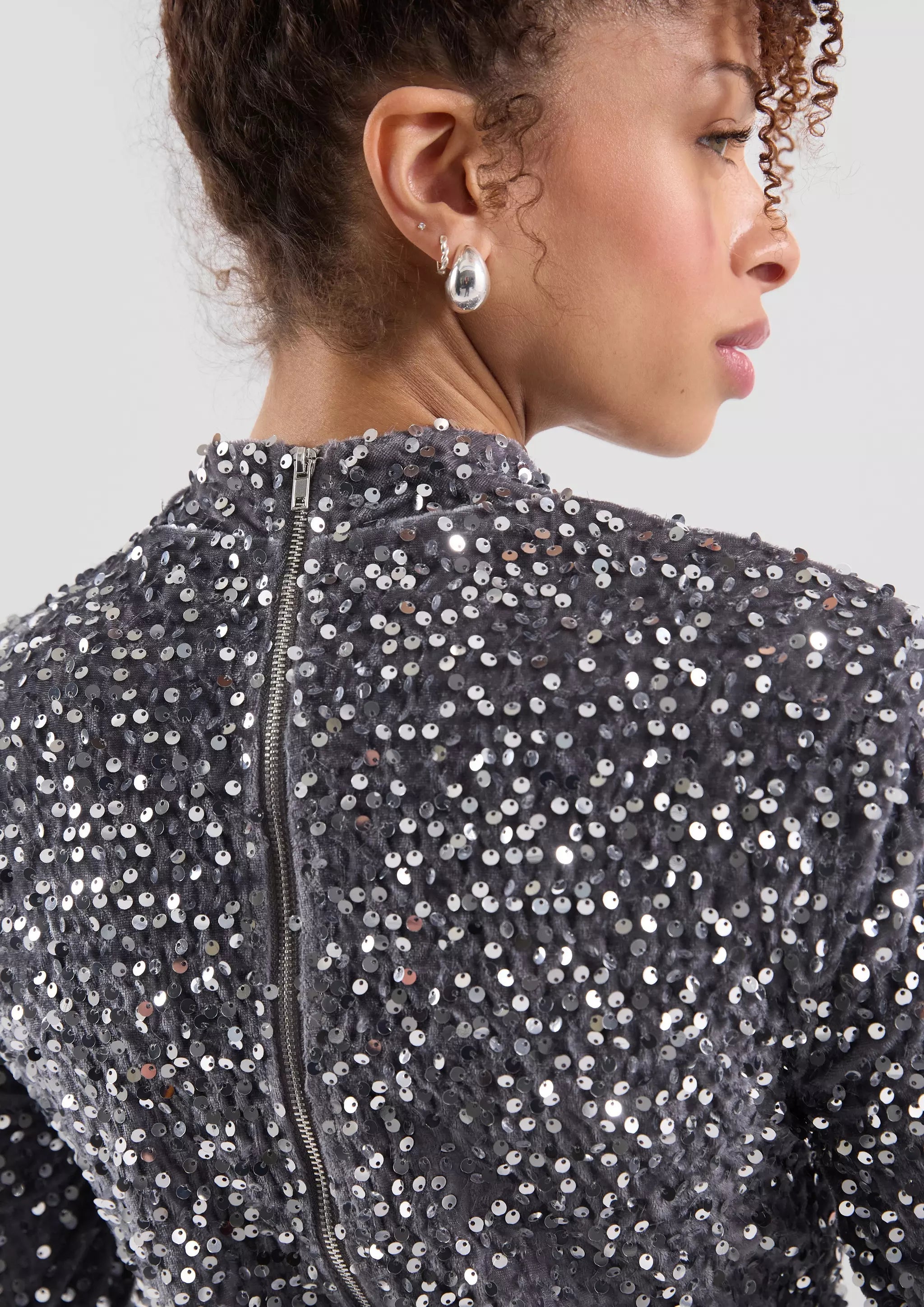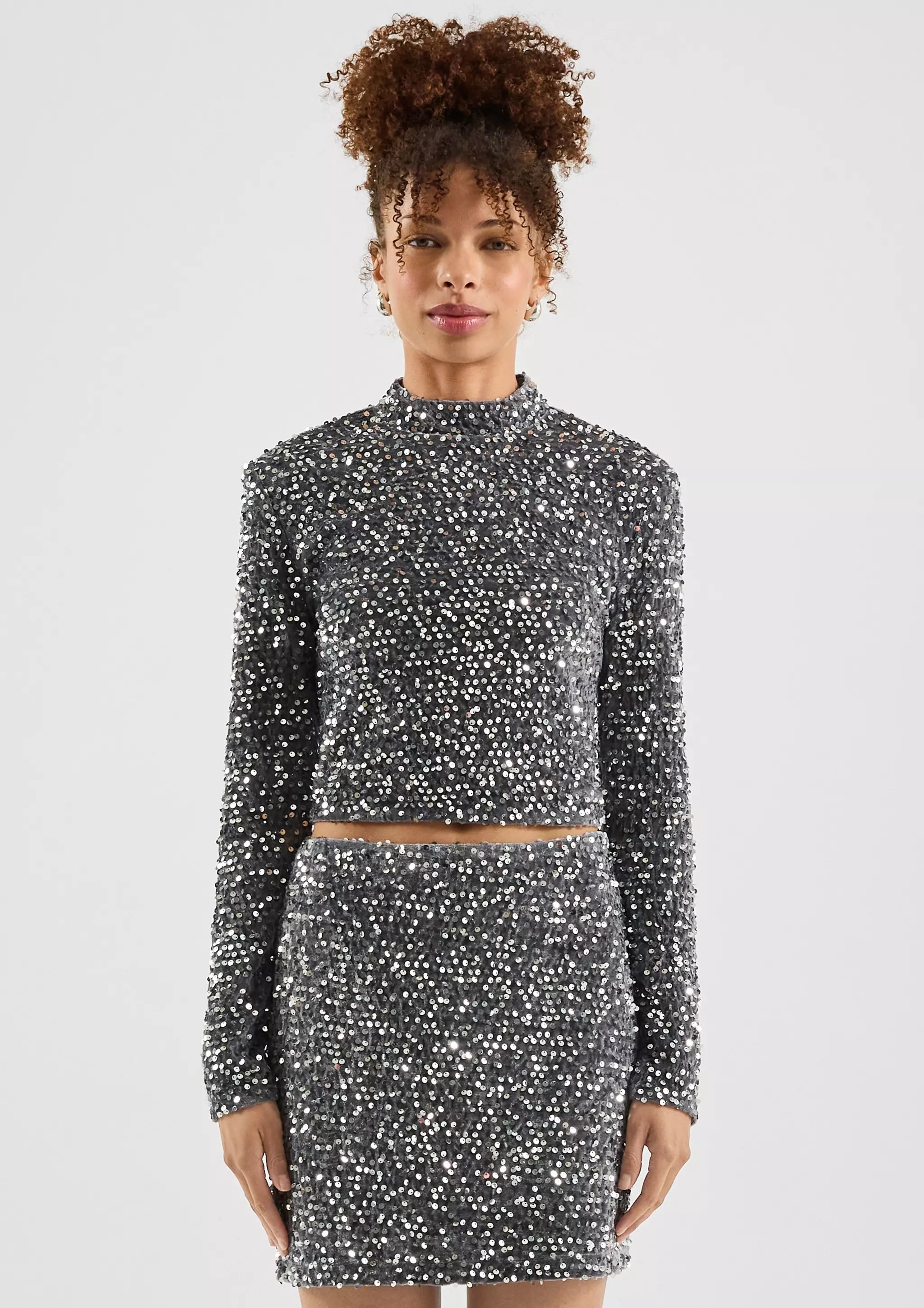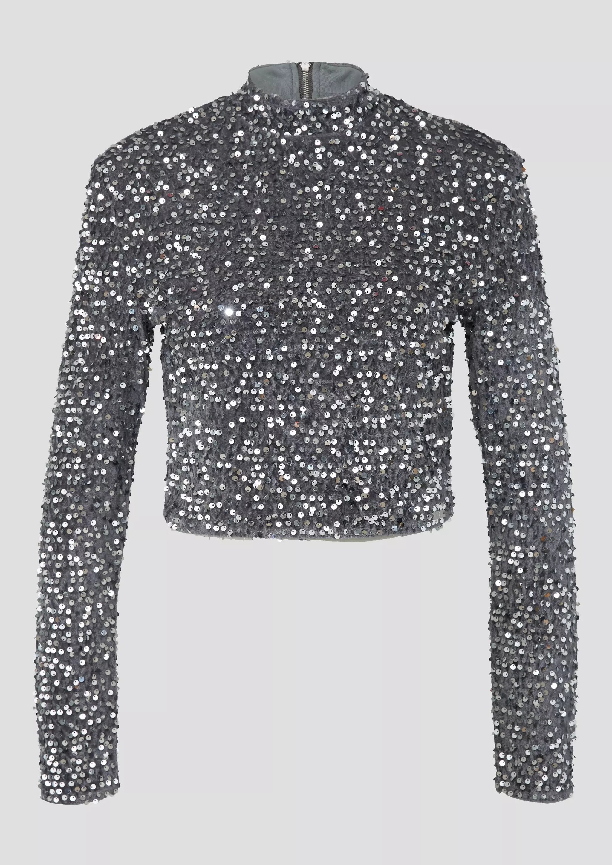 Dieses glamouröse Paillettenshirt aus der QS x Vanessa Mai Kollektion bringt Glanz in deinen Style. Der leicht elastische Samt mit silber-metallischem Finish und Stehkragen sorgt für echte Hingucker-Momente. Die Slim Fit Passform und verkürzte Länge machen das Langarmshirt zum perfekten Partner für deine Lieblingsjeans – ob beim Ausgehen oder spontanen Treffen mit Freunden.
