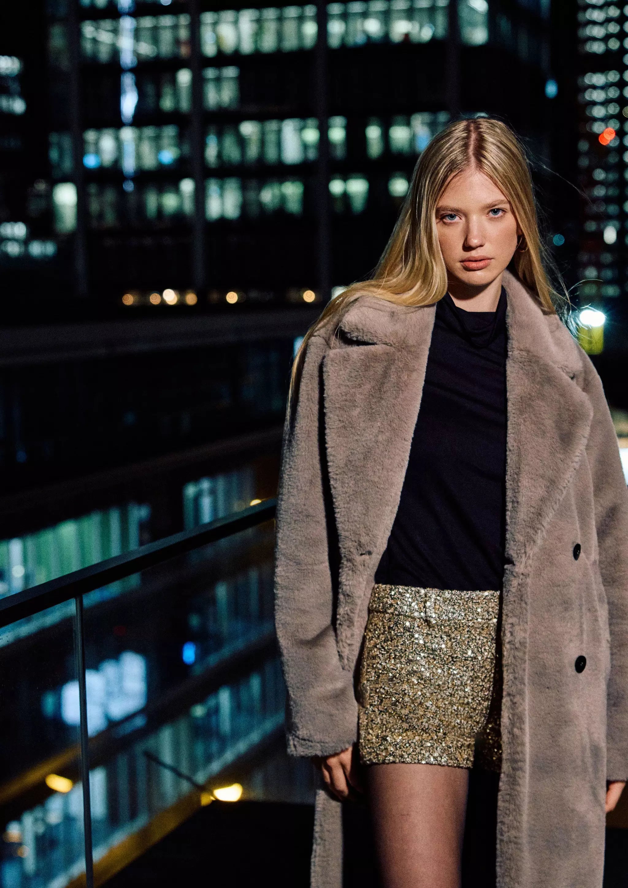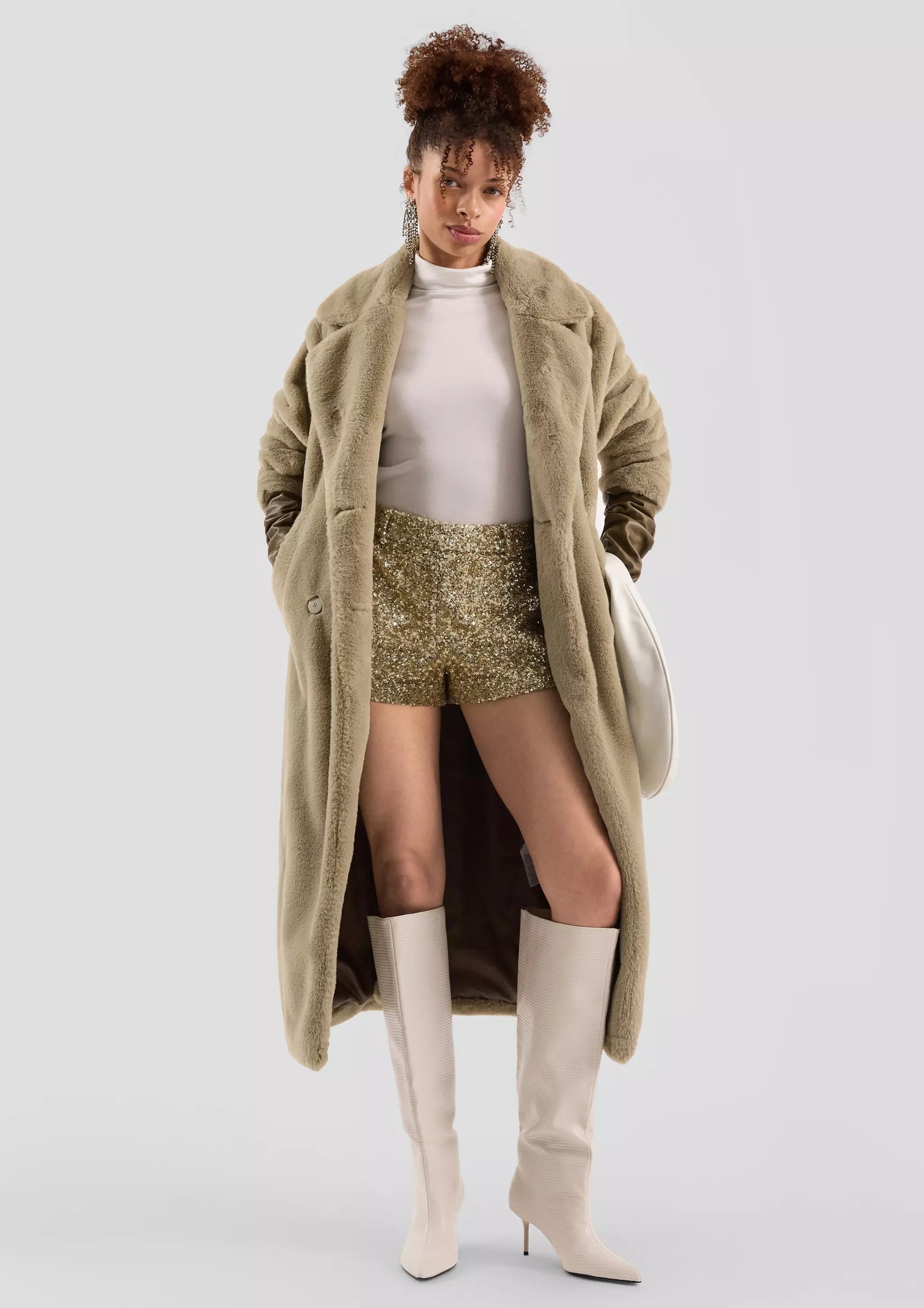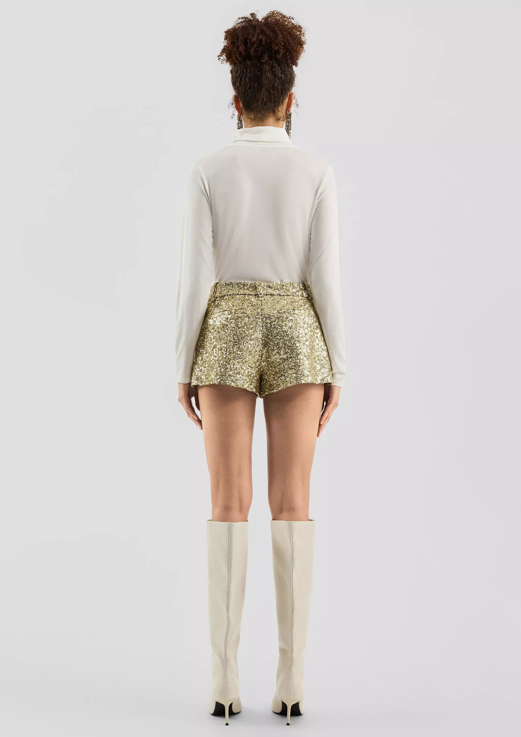 Diese glitzernden Pailettenshorts aus der QS x Vanessa Mai Kollektion bringen dich glamourös durch jede Party-Nacht. Der goldfarbene Glanz und die funkelnden Pailletten sorgen für deinen großen Auftritt, während die Mid-Rise-Passform und Regular Fit dir angenehmen Tragekomfort bieten. Mit verdecktem Reißverschluss und Gürtelschlaufen sitzt alles perfekt – bereit für unvergessliche Momente.