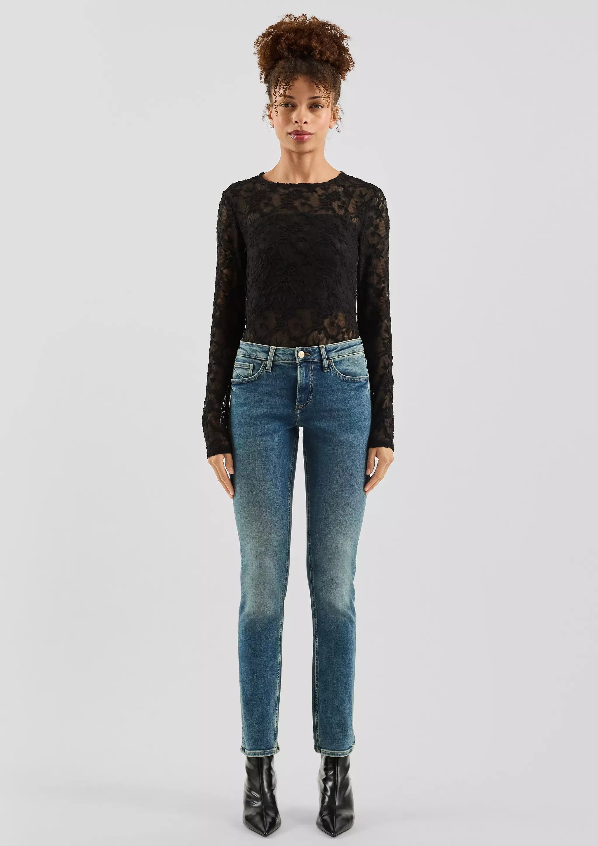 Diese Jeans Catie mit Slim Fit und Mid Rise ist dein perfekter Begleiter für entspannte Tage. Der elastische Denim sorgt für optimalen Tragekomfort, während Used-Effekte dem Look eine lässige Note geben. Die Slim Leg Silhouette passt zu allem – von Sneakers bis Boots. Klassische 5-Pocket-Form trifft auf moderne Passform.