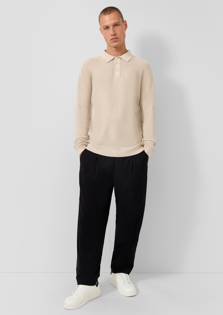 Dieser Strickpullover im Polo-Style bringt lässigen Strukturstrick und geknöpften Kragen zusammen. Die Regular Fit Passform sitzt entspannt, während Langarm und Rippblende am Saum für den perfekten Alltagslook sorgen. Ob Campus, Café oder Couch – du bist immer gut angezogen und bleibst dabei authentisch.