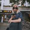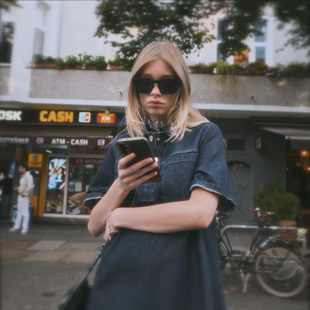 Dieser monochrome Look mixt Blue Denim mit einem dunkelblauen Pullover – dazu Boots und Shopper. Perfekt für einen entspannten Tag in der City oder einen Gallery Walk mit der Crew.