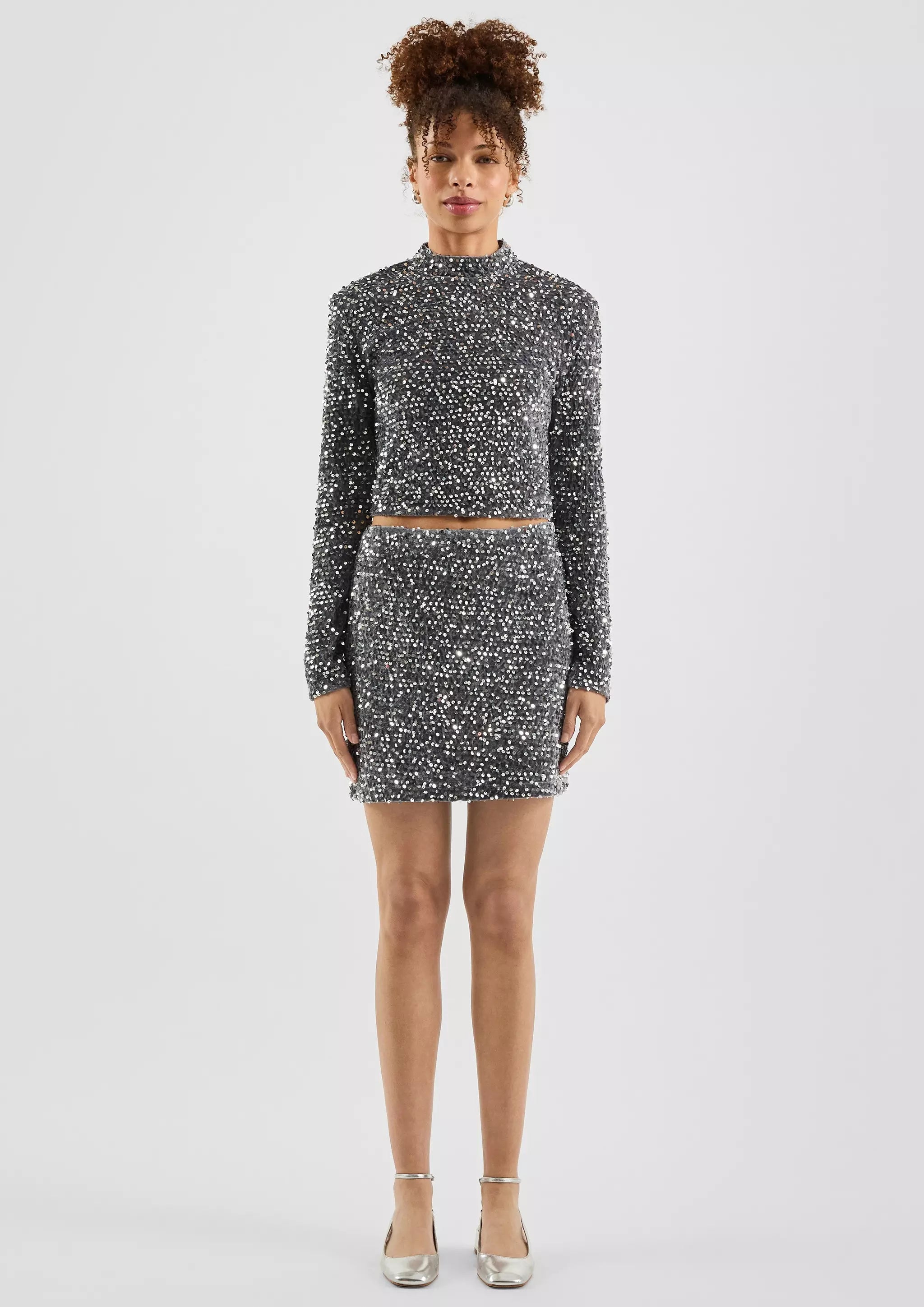 Dieser Paillettenrock aus weichem Samt bringt glamourösen Glanz in deine Partynächte. Die funkelnden Pailletten setzen dich perfekt in Szene, während die elastische Slim Fit-Passform für den idealen Sitz sorgt. Mit Mid Rise-Bund und verdecktem Reißverschluss wird dieser Mini zum femininen Statement-Piece, das jeden Auftritt unvergesslich macht.