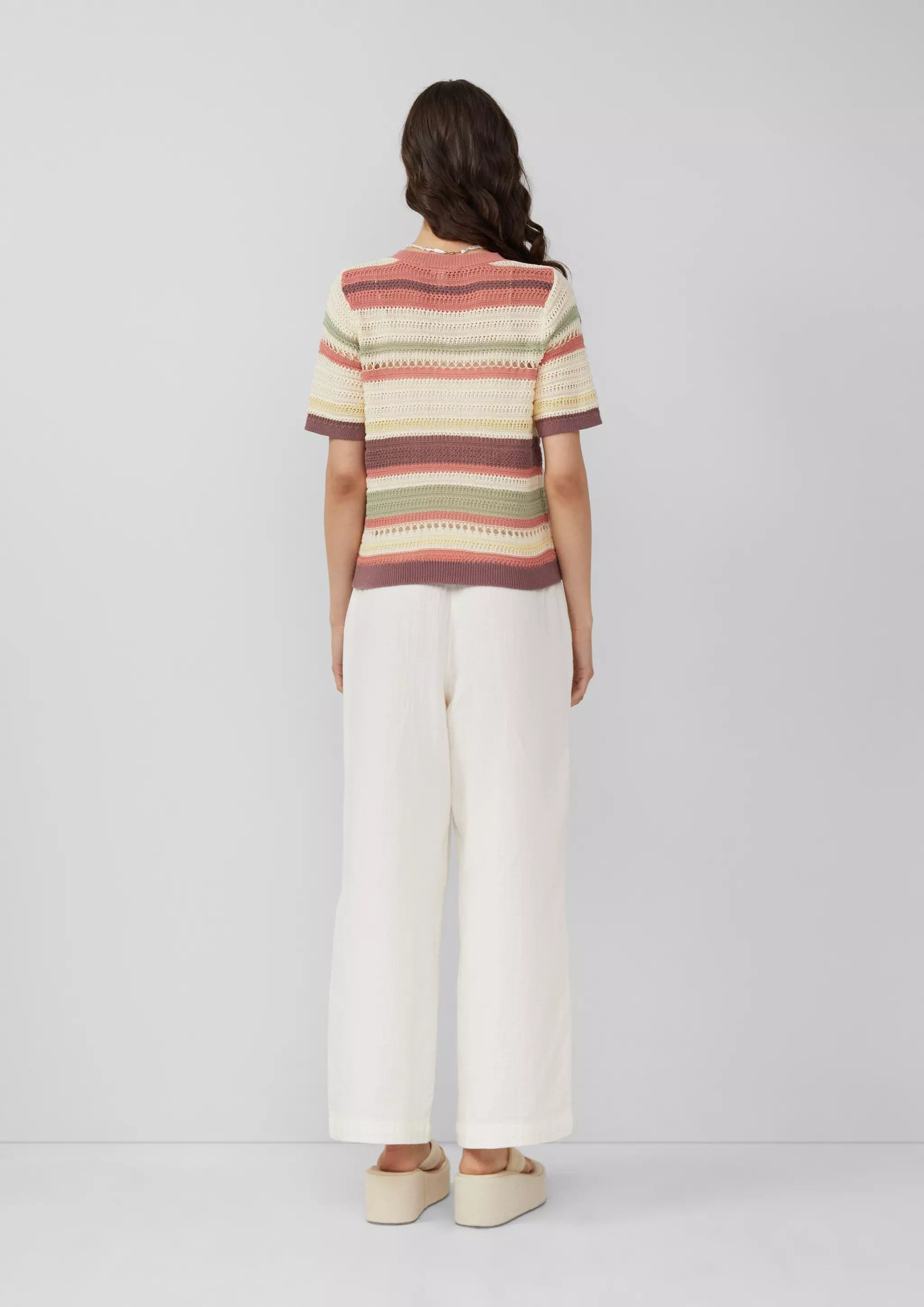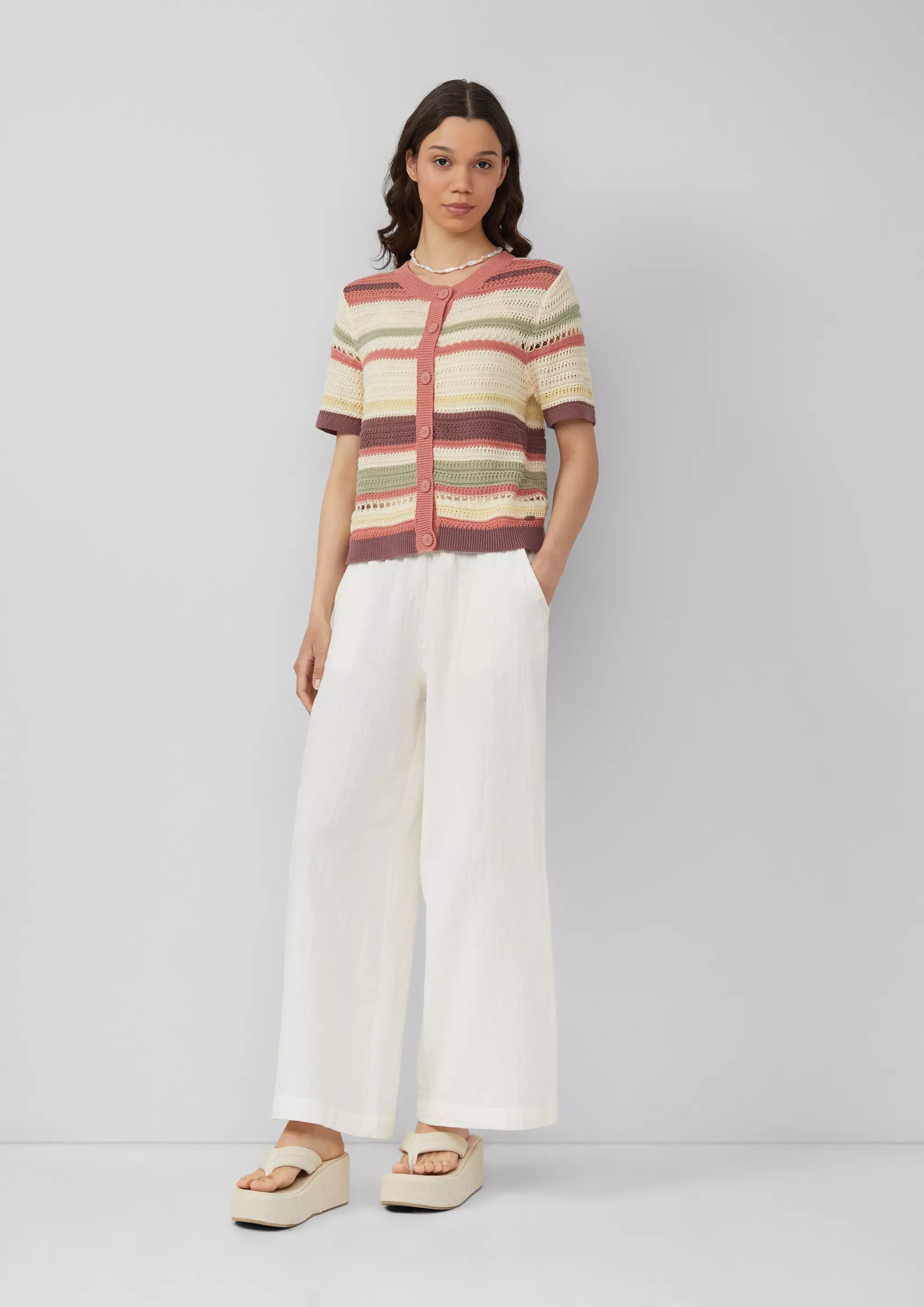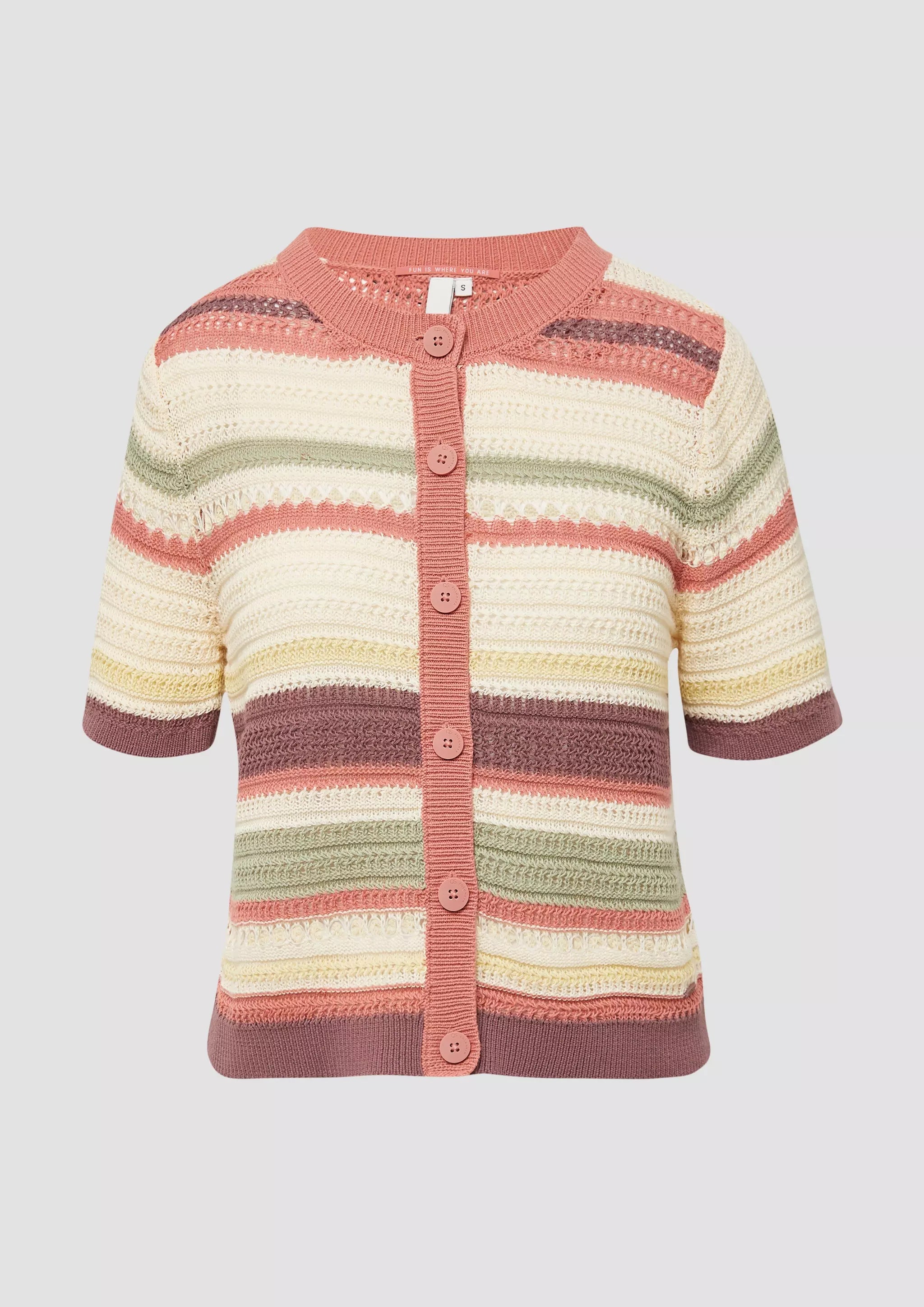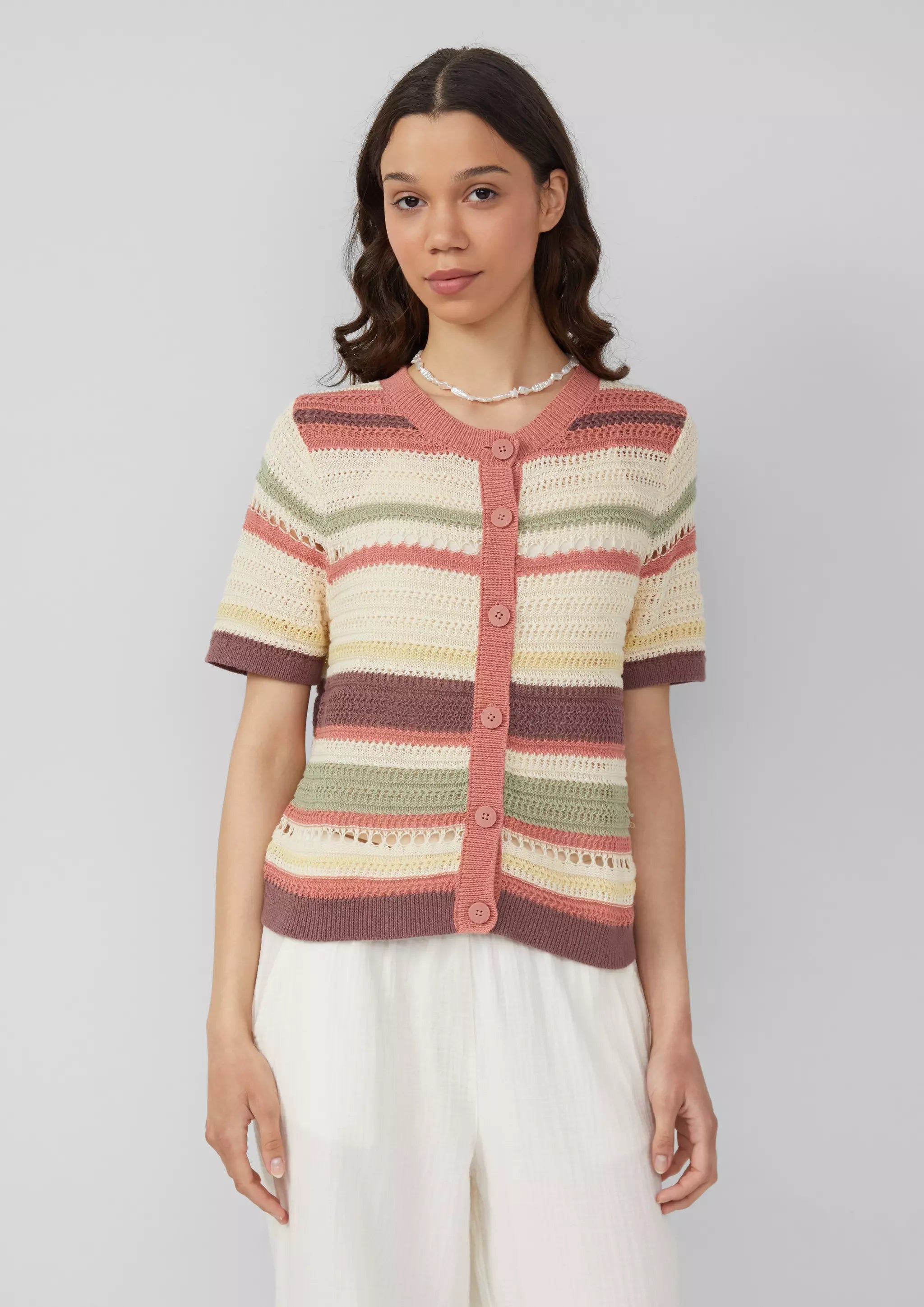 Strickjacke mit Charme: Dieser Kurzarm-Cardigan in Häkeloptik ist dein neuer Liebling für entspannte Nachmittage oder spontane Treffen. Mit gestrickten Streifen und Knopfleiste – so unkompliziert kann Stil sein!