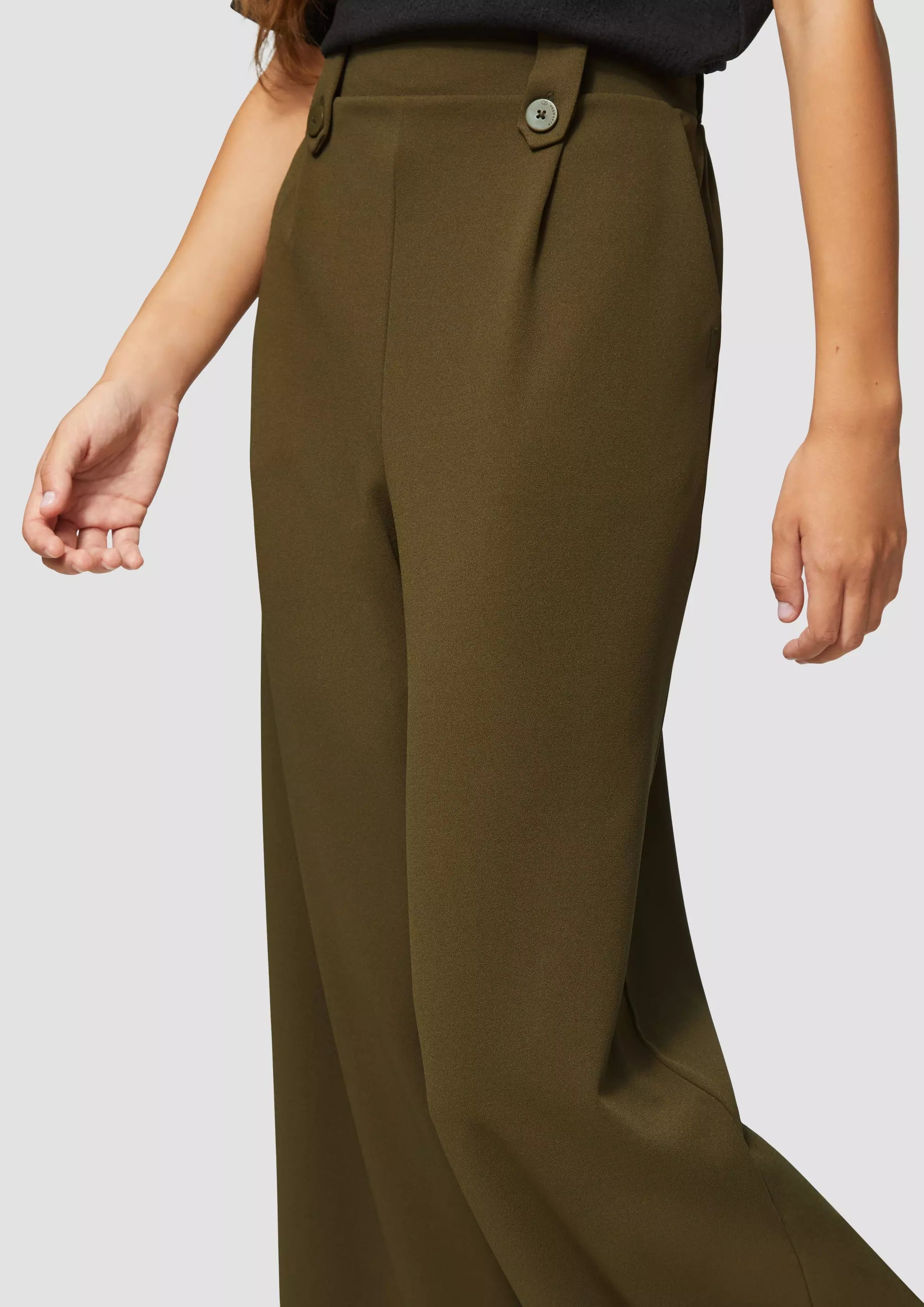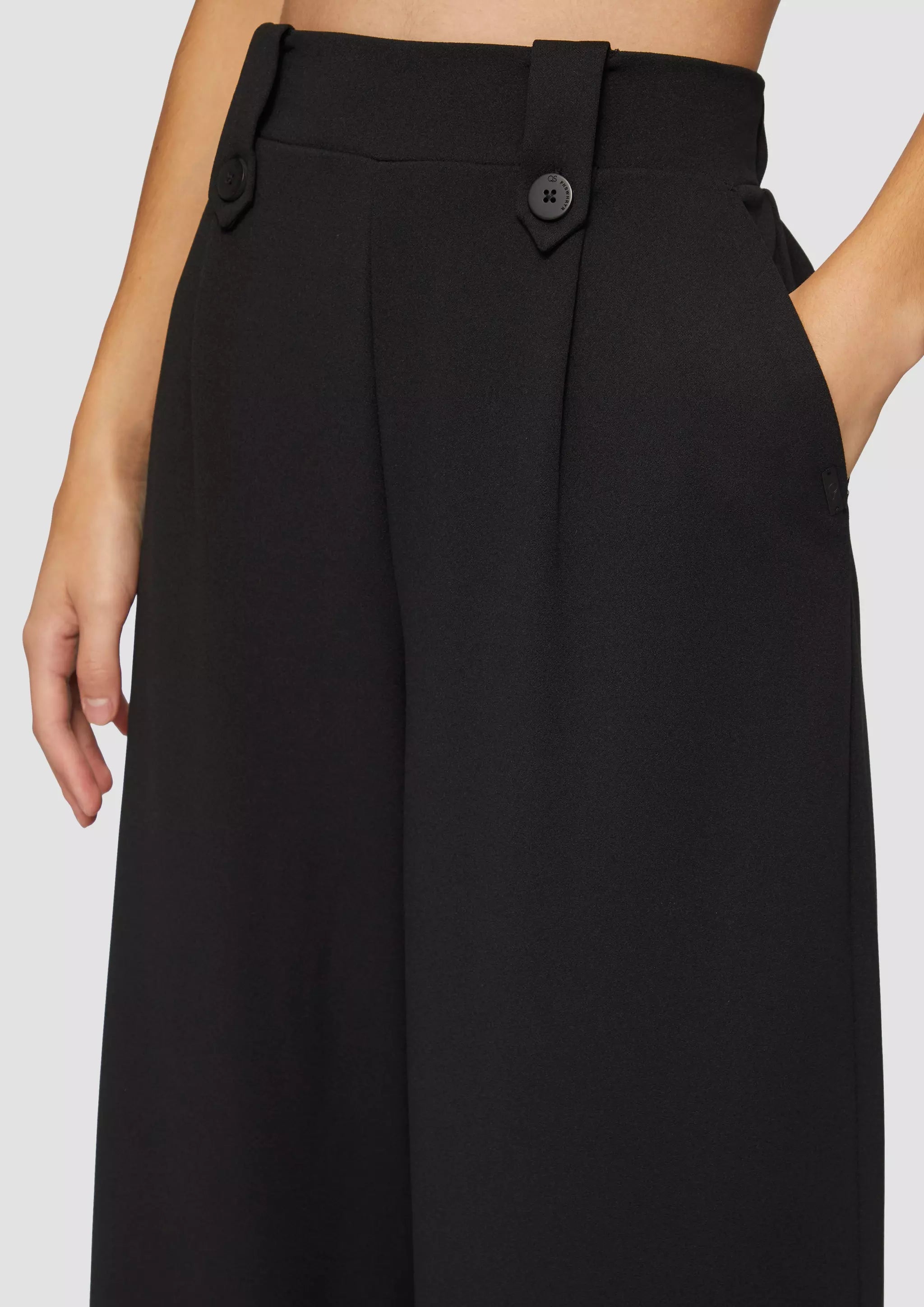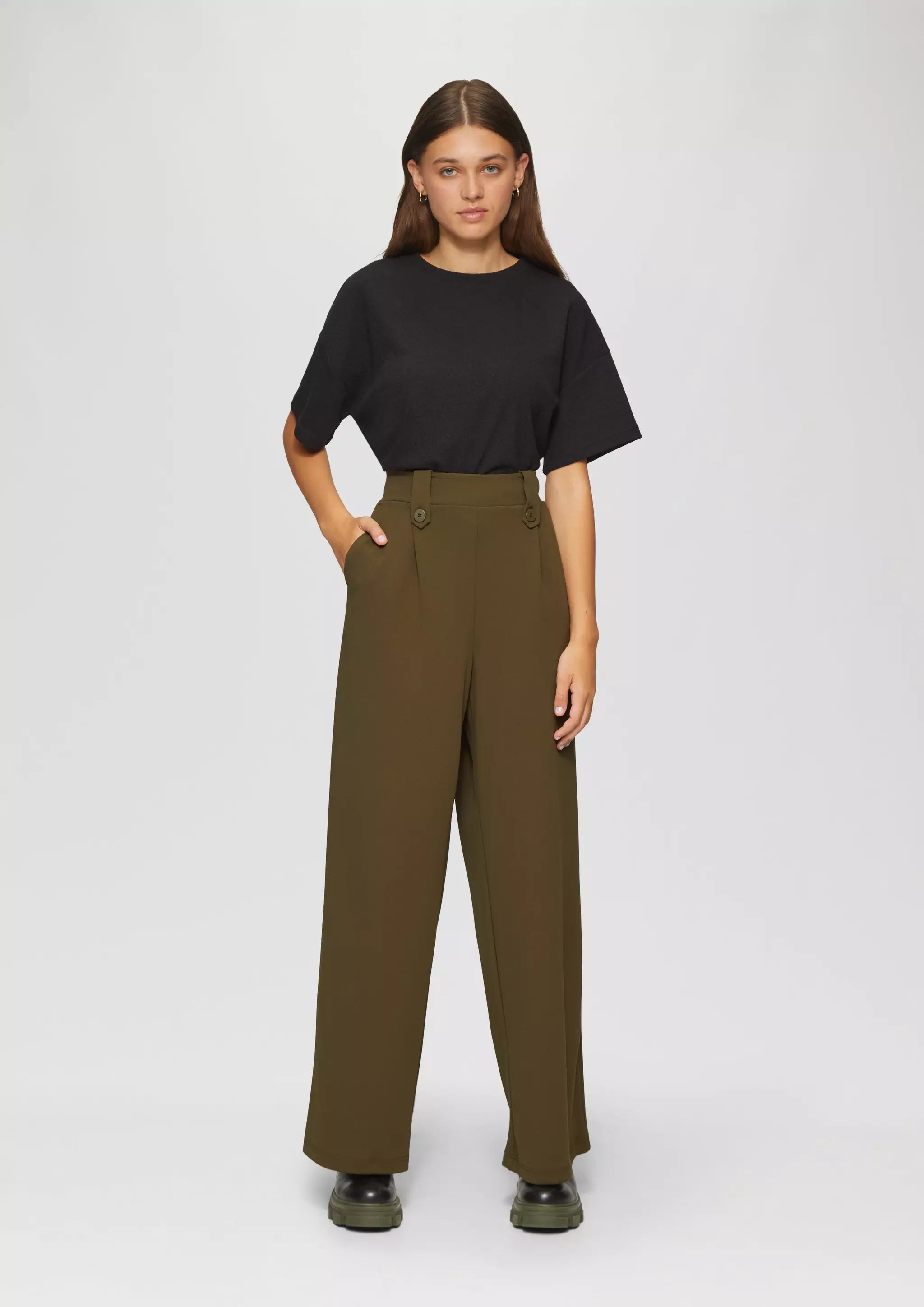 Lässige Crêpe-Hose mit Wide Leg und hohem Bund für deinen entspannten Look. Der elastische Interlockjersey sorgt für Komfort, während Zierknöpfe und Gürtelschlaufen stylishe Akzente setzen. Perfekt für coole Outfits im Alltag und bei Events.