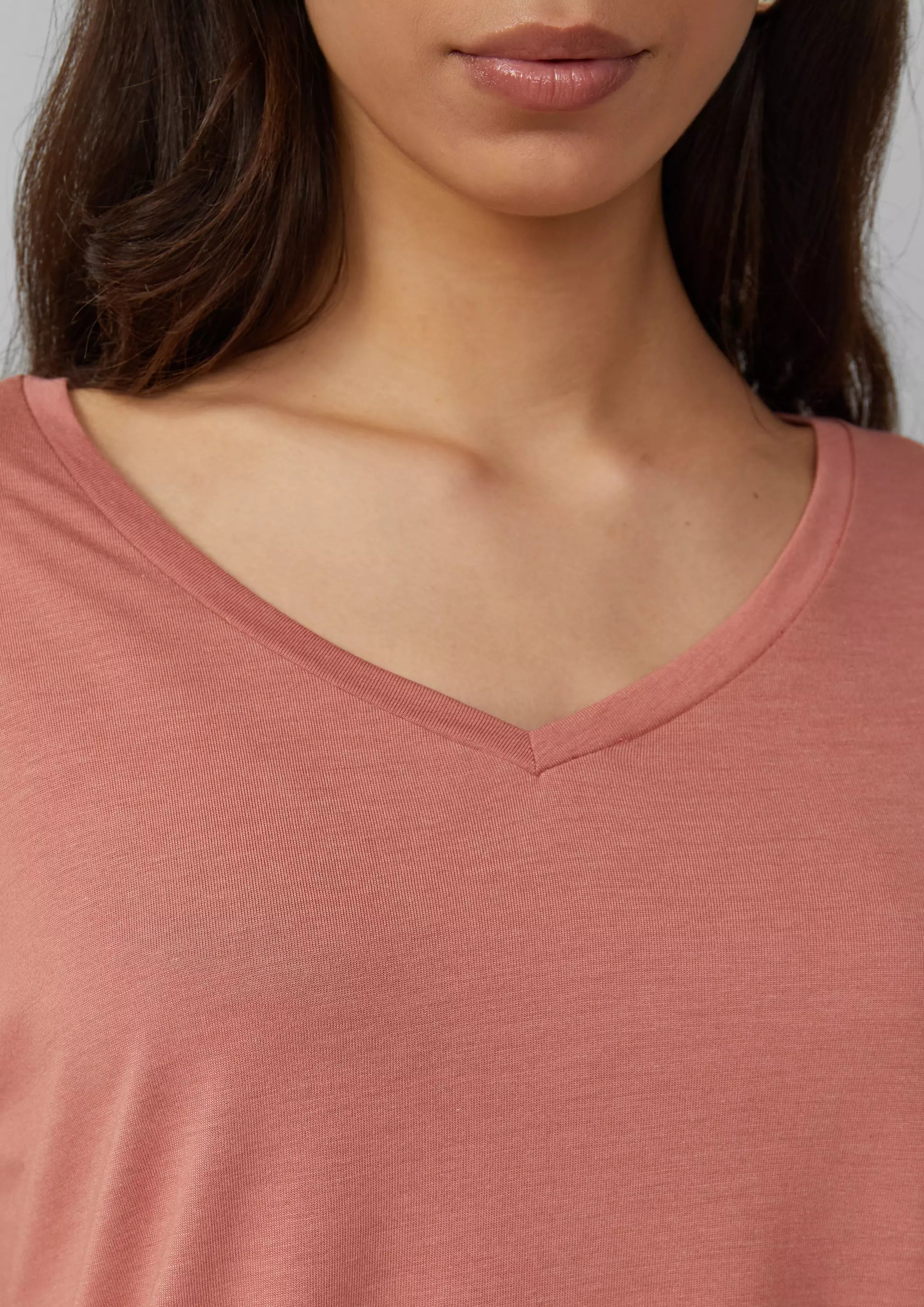 Lässig und feminin zugleich: Dieses weiche T-Shirt mit V-Ausschnitt ist dein neuer Liebling für entspannte Tage. Ob beim Kaffee mit Freundinnen oder beim Stadtbummel – du fühlst dich einfach wohl. Perfekt für deinen Casual-Look!
