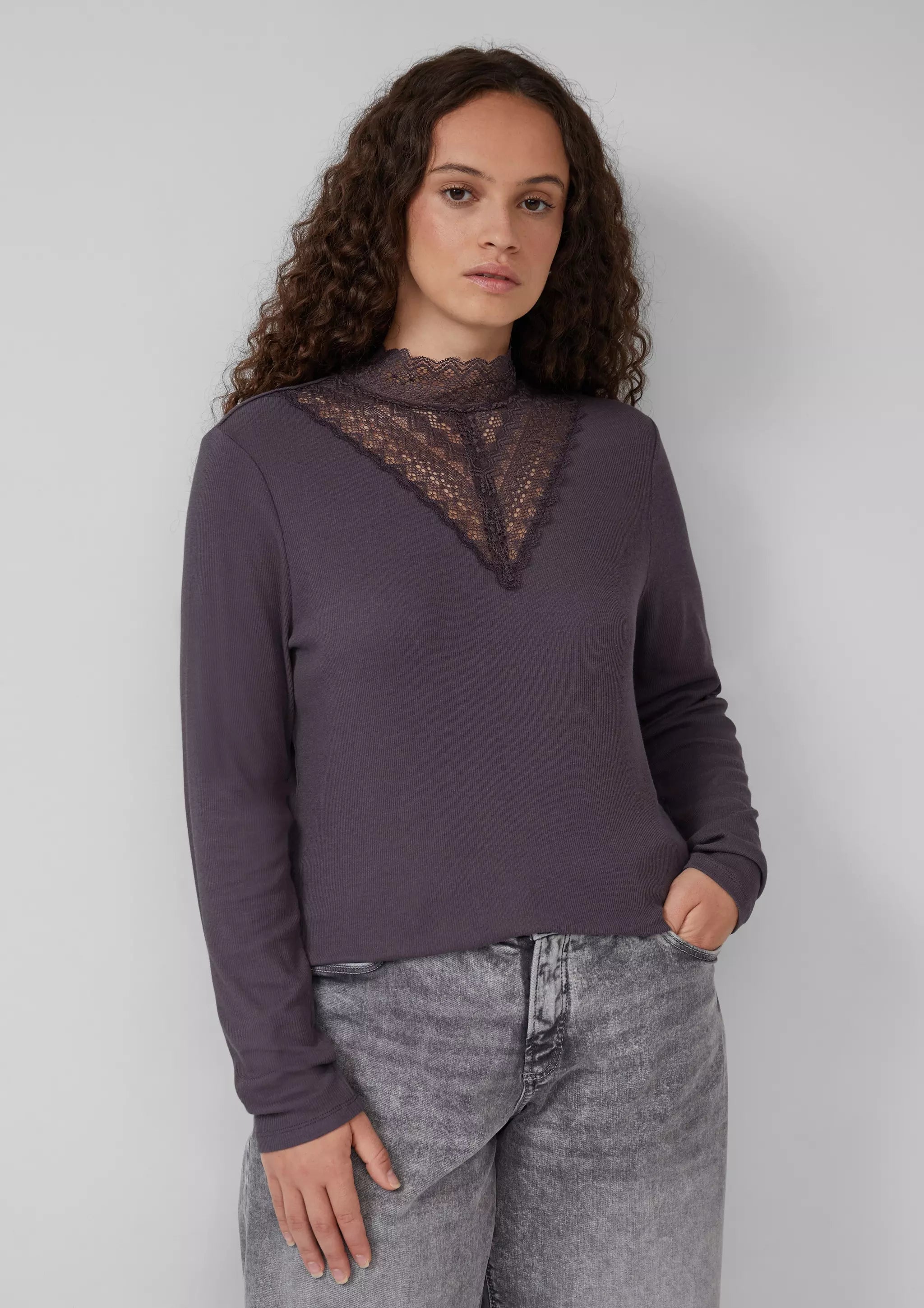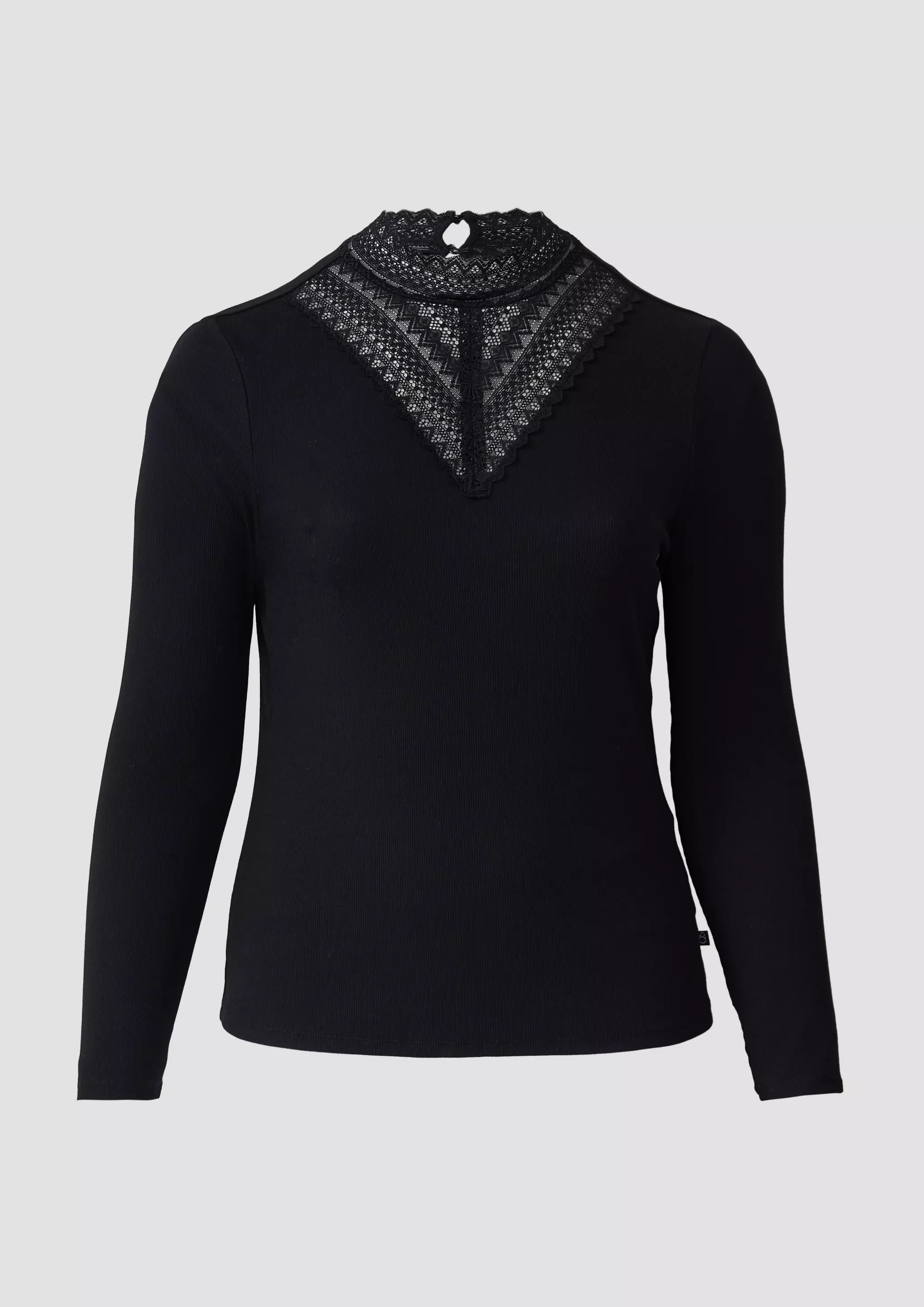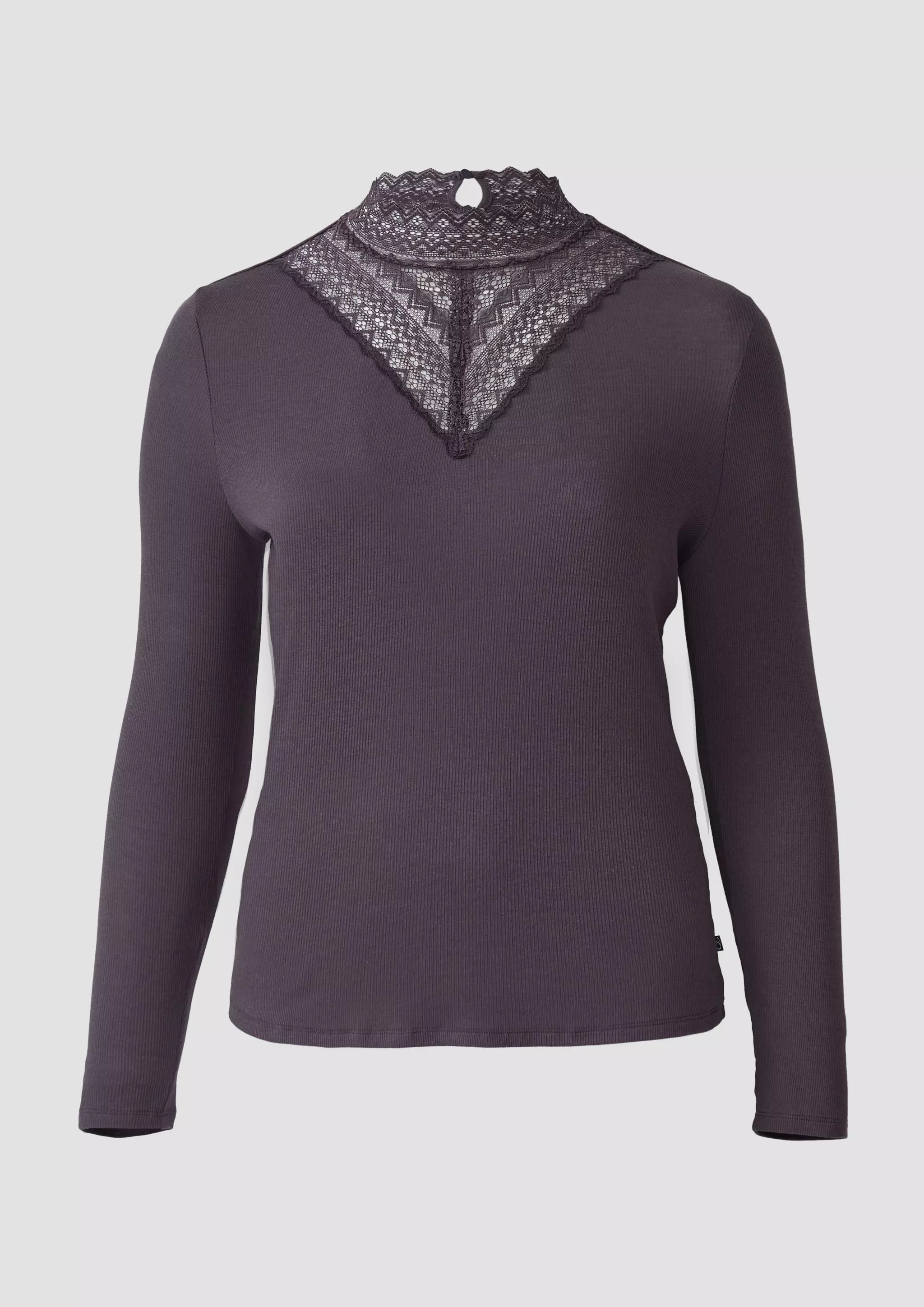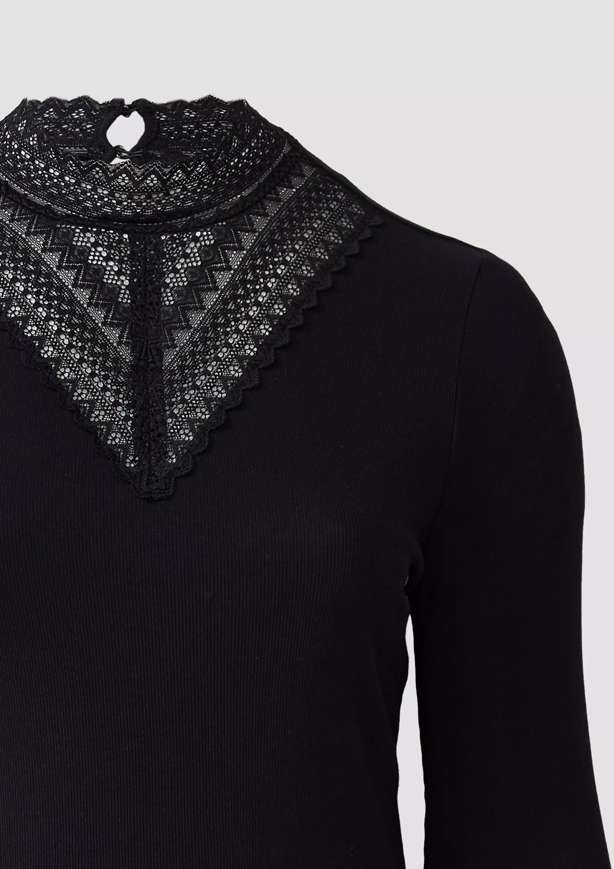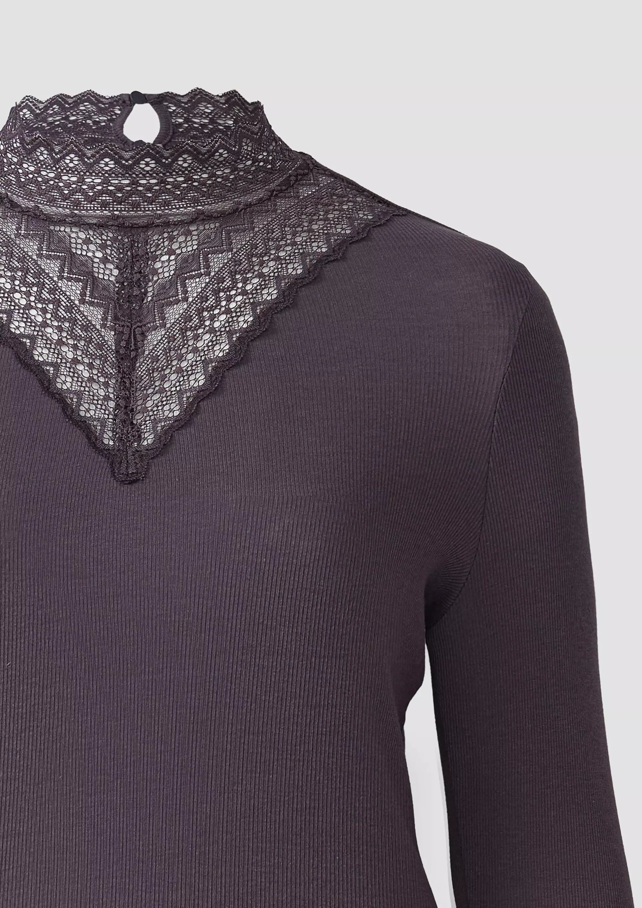 Rippshirt mit Spitzeneinsatz und Stehkragen aus Spitze