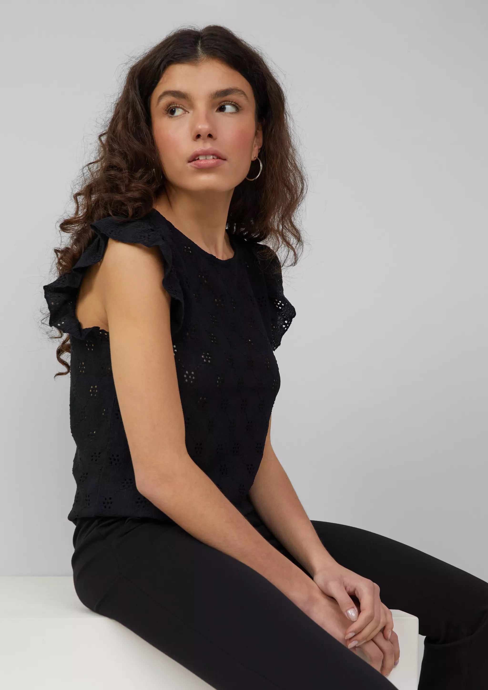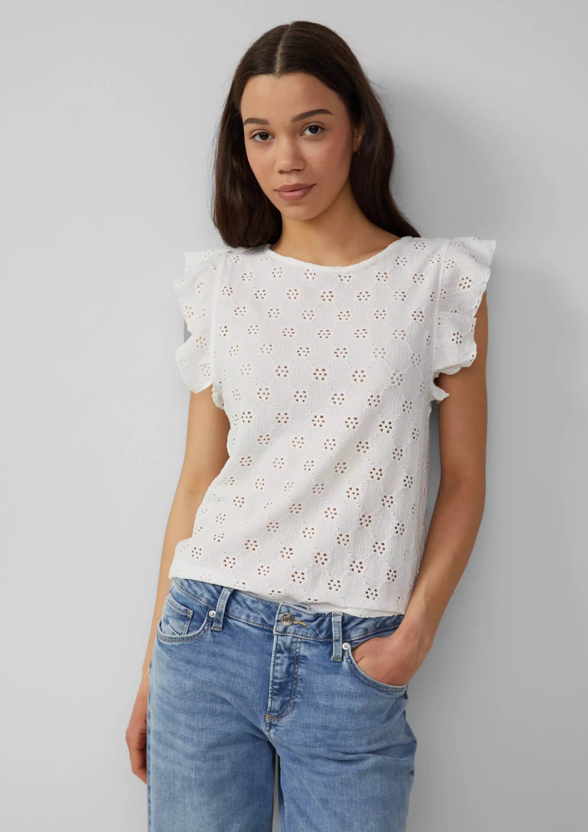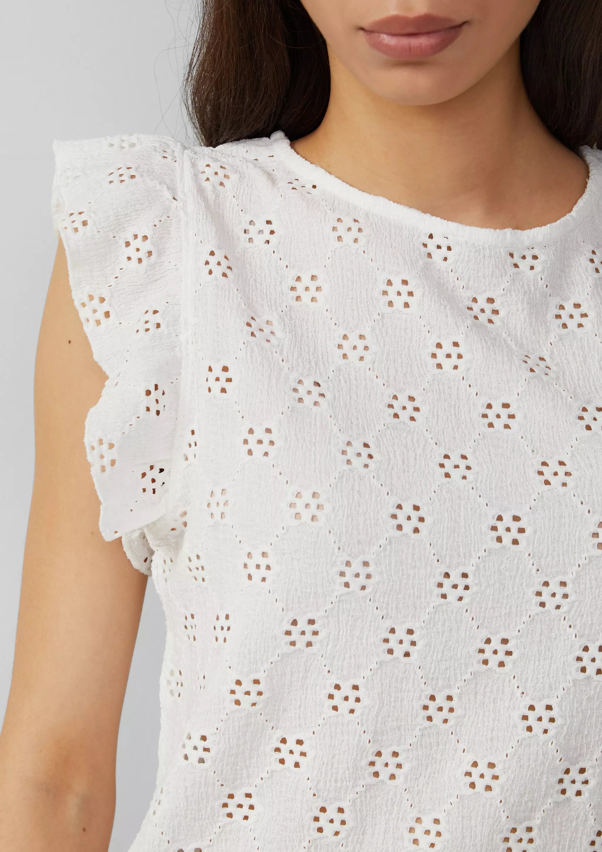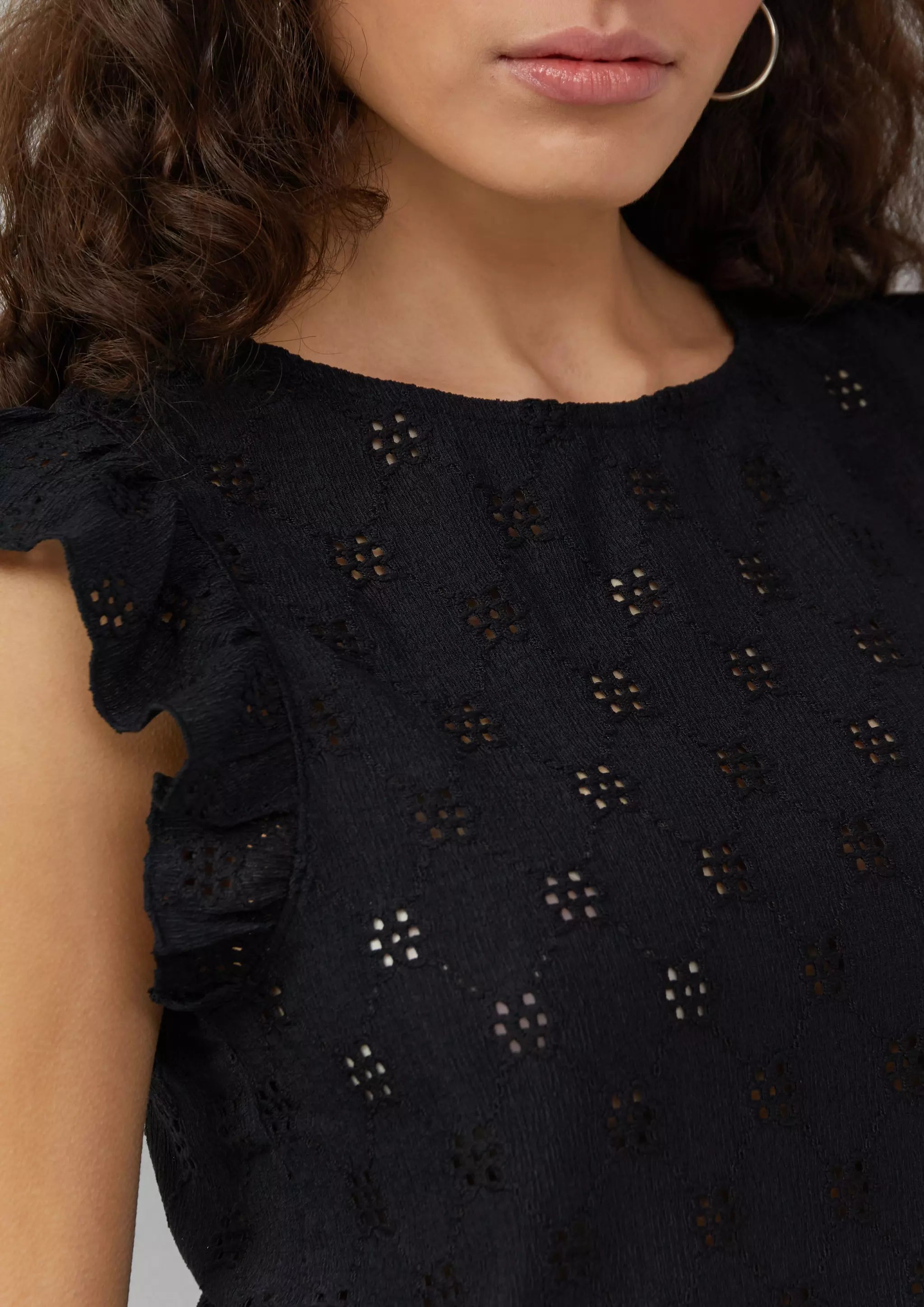 Top mit Lochstickerei und Volant am Arm