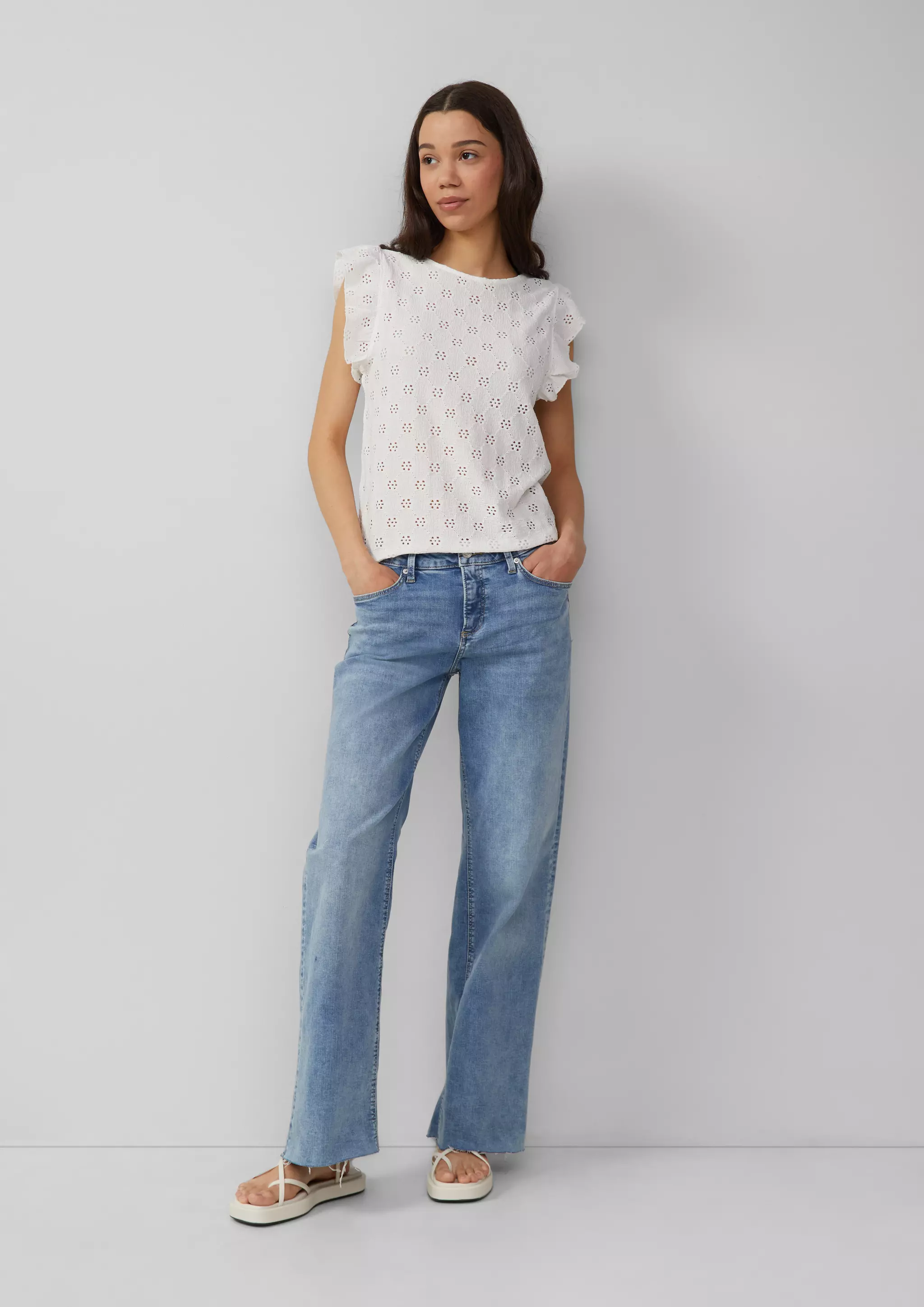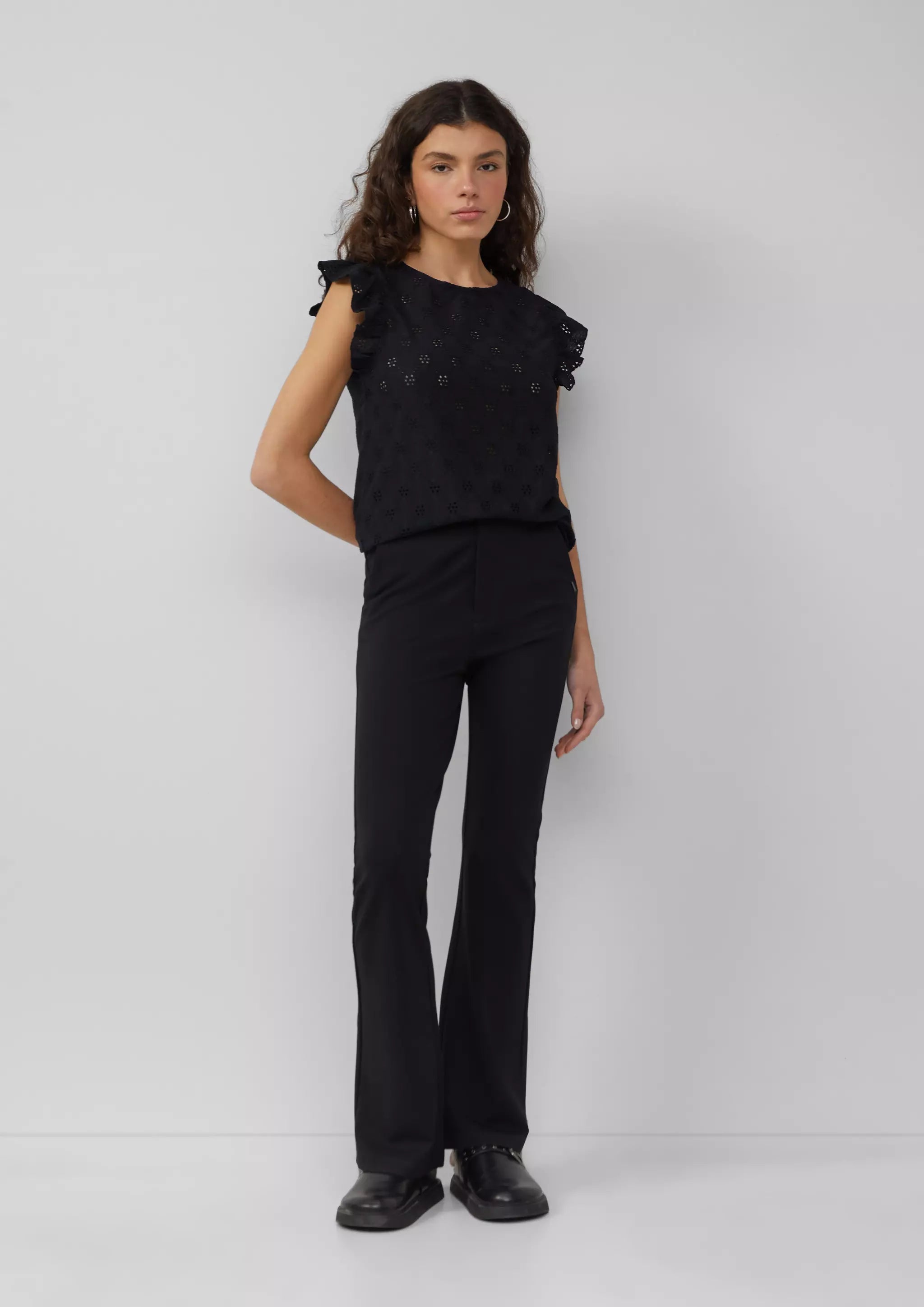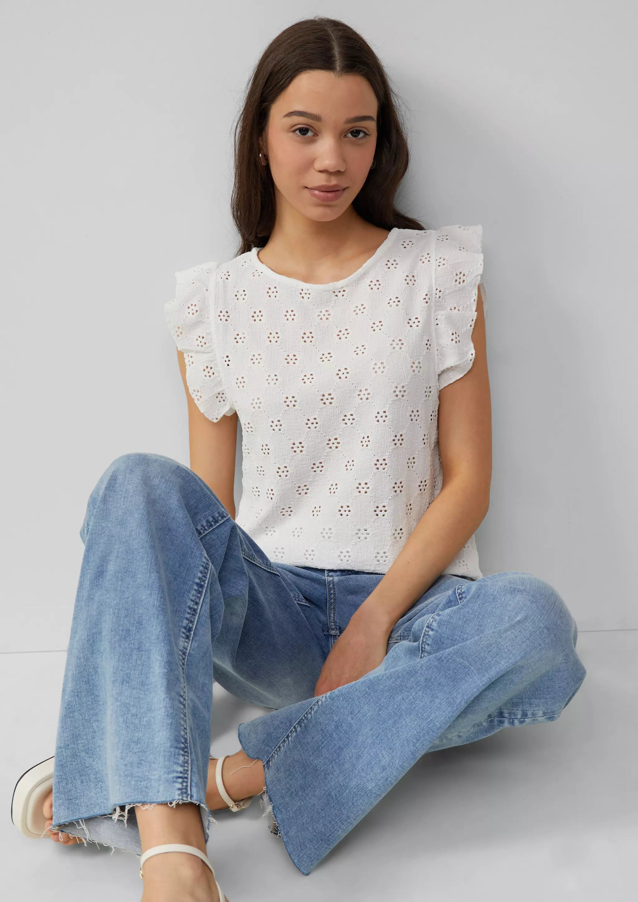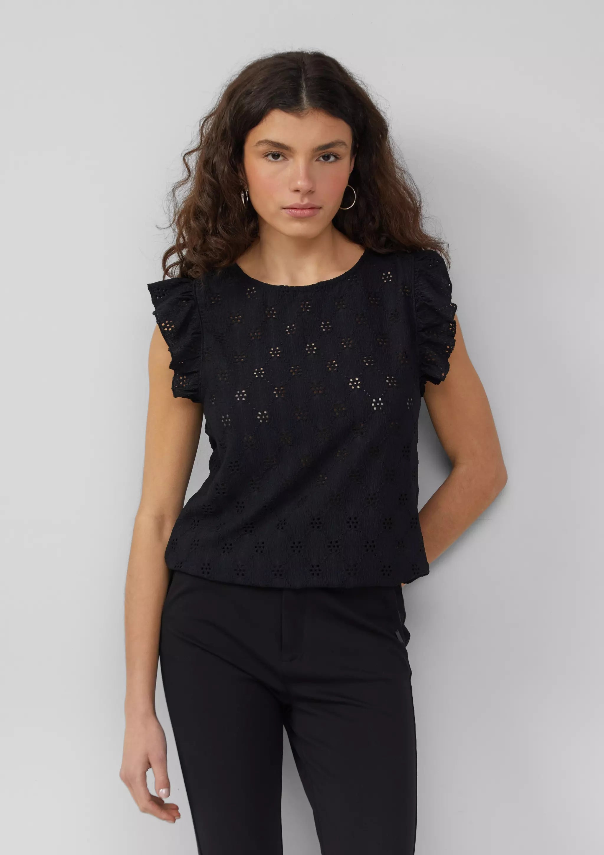 Top mit Lochstickerei und Volant am Arm