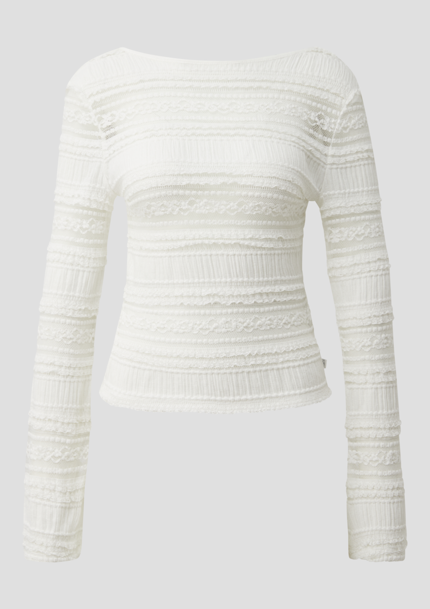 Dieses Spitzenshirt bringt eleganten Flair in deinen Alltag. Der Jacquard-Stoff mit semi-transparenter Optik und die coolen Trompetenärmel machen den Look besonders. Der große Rückenausschnitt setzt stylische Akzente, während die Slim Fit Passform perfekt sitzt. Ob Date oder Party – mit diesem Langarmshirt ziehst du alle Blicke auf dich.