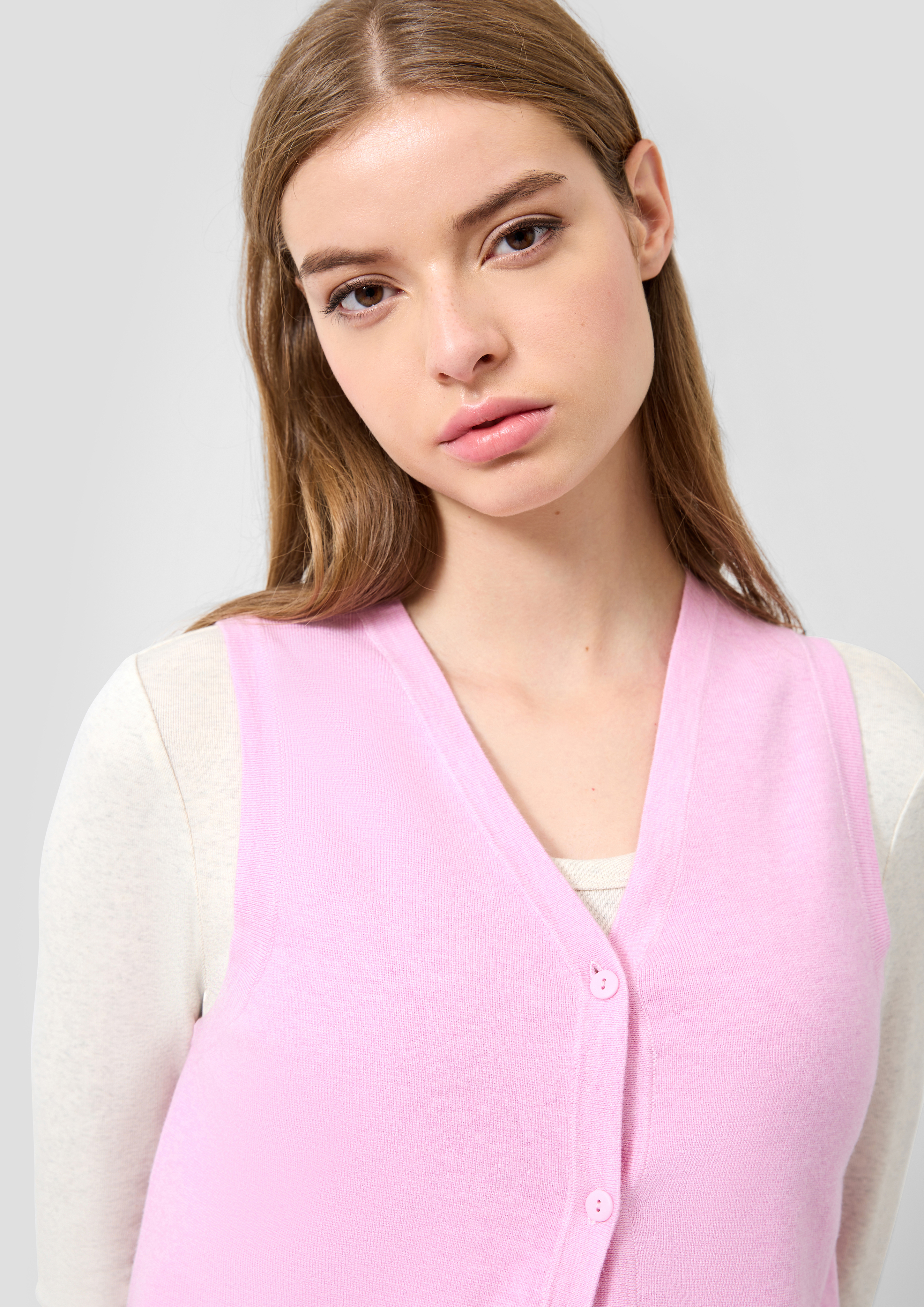 Diese weiche Strickweste mit V-Ausschnitt bringt entspannten Style in deinen Look. Die durchgeknöpfte Variante im Slim Fit passt perfekt zu Jeans oder Rock und macht jedes Outfit lässig-cool. Ärmellos geschnitten, ist sie dein idealer Begleiter für spontane Treffen oder entspannte Tage. Einfach überwerfen und losgehen!